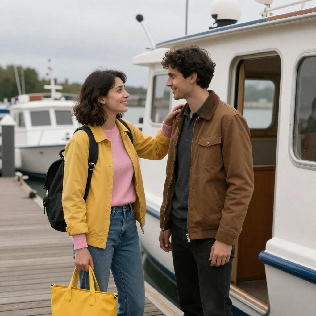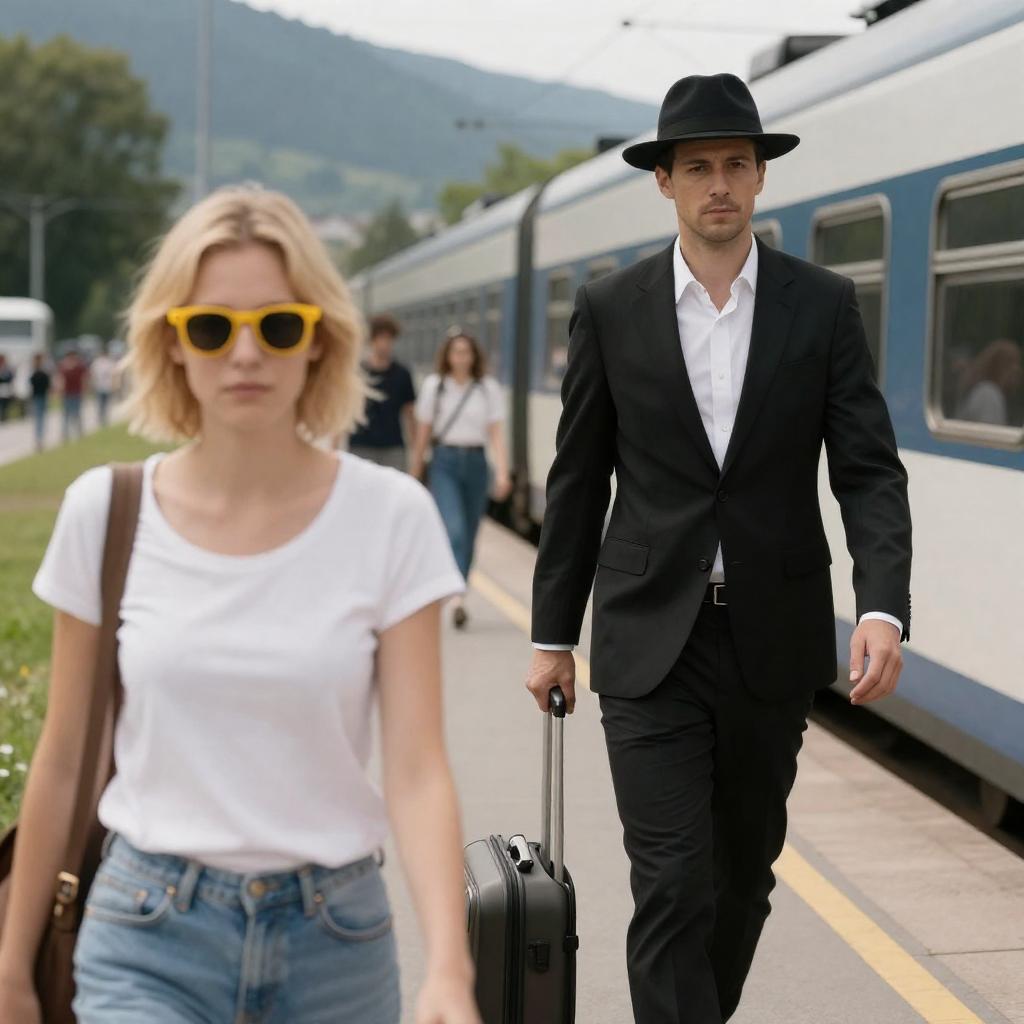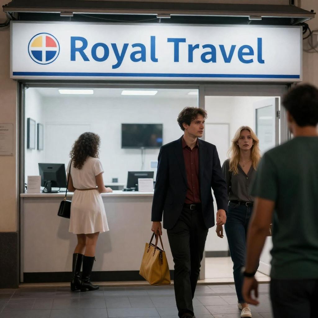 Nighttime scene outside a Royal Travel agency with bright illuminated signage. A man in a dark suit and burgundy shirt carries a yellow handbag walking alongside a blonde woman wearing a grey blouse and blue jeans. A curly-haired woman in a white dress and black boots stands at the counter inside the agency. Another man in a green shirt is visible in the foreground, slightly out of focus.