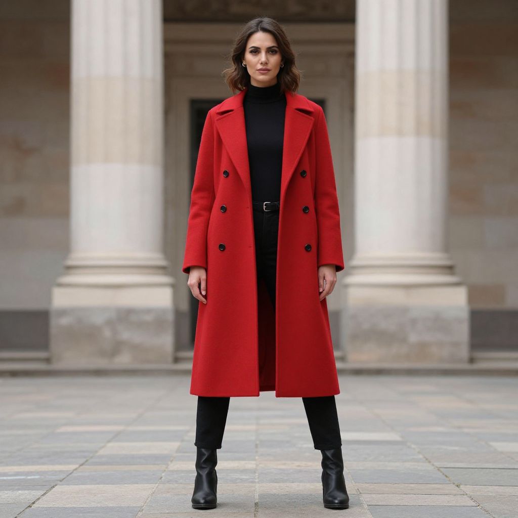 Photograph of a woman standing on a stone-paved courtyard, framed by two large white columns. She has wavy, shoulder-length brown hair and a serious expression. She wears a bright red, double-breasted, knee-length coat with black buttons, a black turtleneck, black pants, and black ankle boots. The background features a beige stone wall with a dark doorway. The image has a crisp, modern aesthetic, emphasizing the vibrant red coat against the neutral background. The woman's stance is centered and confident.
