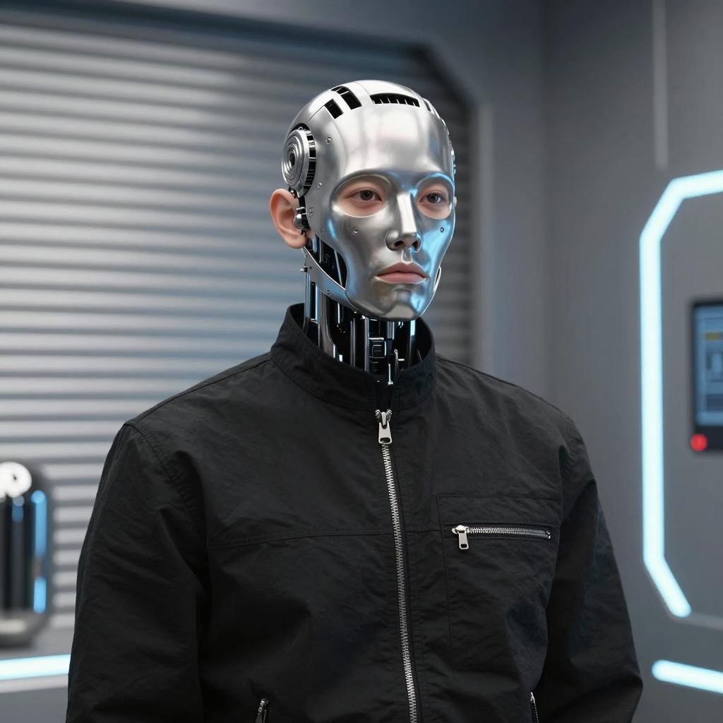 A man with a metallic, robotic face, wearing a black shirt with a zipper, in a futuristic setting. Background includes metallic blinds, blue and white lights, and reflective surfaces. The man has a neutral expression and is slightly turned to the right. Several reflective objects are visible in the background.