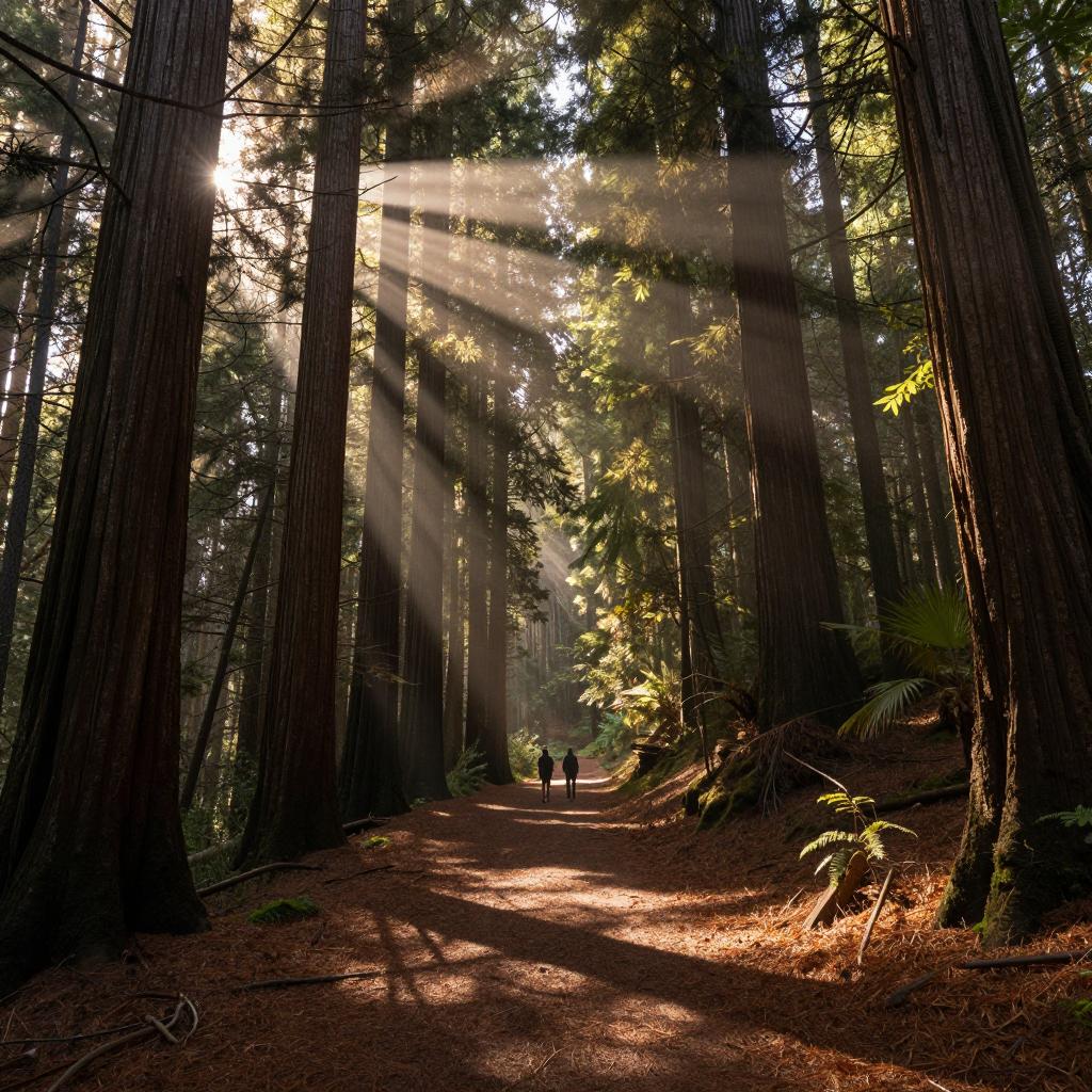 Photograph of a forest path. Tall redwood trees with sunlight streaming through branches. Two small, dark figures walking in the distance on the path. Golden sunlight on forest floor. Mist in background. Tree trunks in foreground. Sunbeams create patterns on ground.