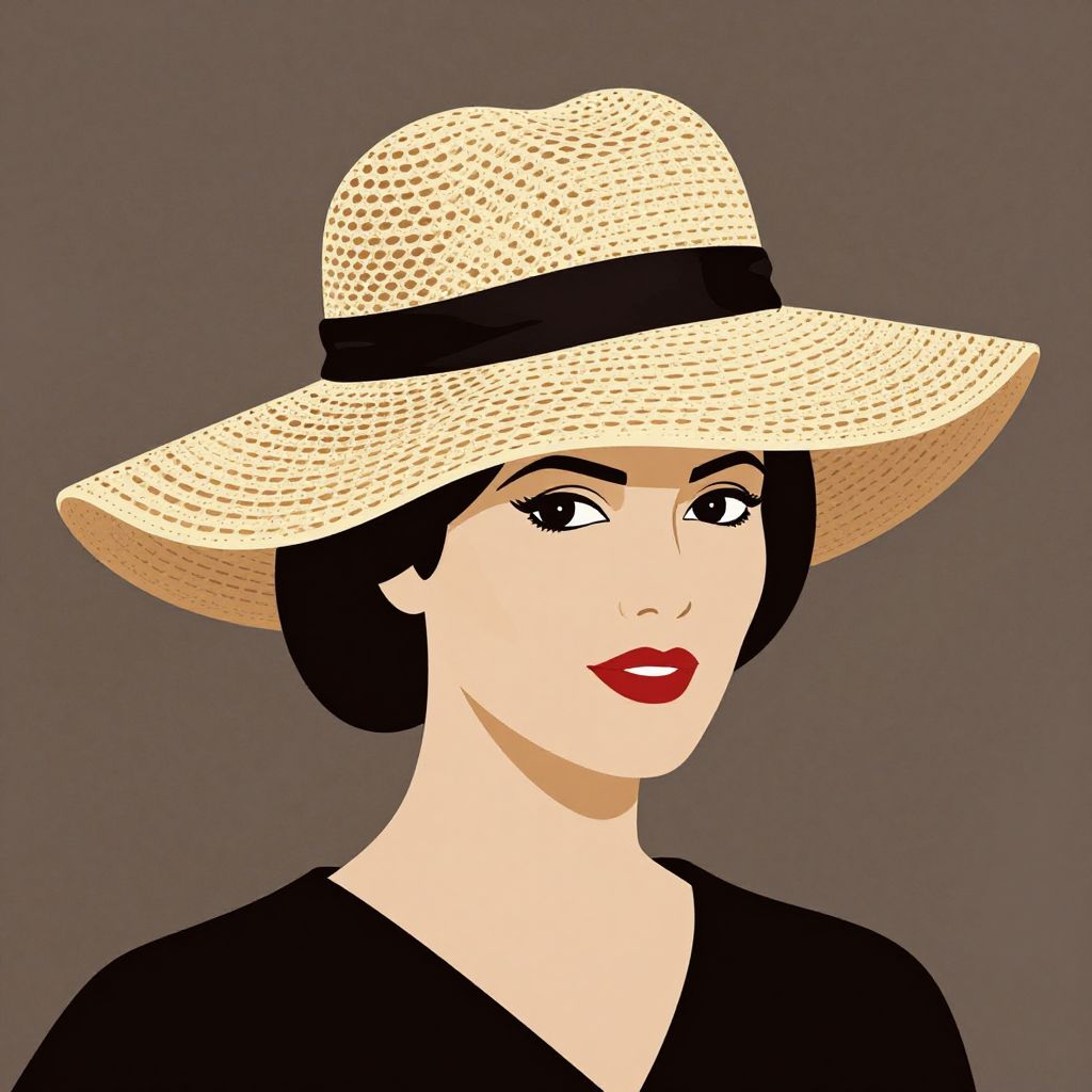 This digital illustration features a stylized portrait of a woman with fair skin and black bobbed hair. She wears a wide-brimmed, beige straw hat with a black band. Her black eyes are accentuated with bold eyeliner, and she has bright red lipstick. She is dressed in a simple black top. The background is a solid, muted brown, which contrasts with her light-colored hat and dark clothing. The art style is reminiscent of vintage pop art, with clean lines and flat colors. The overall composition is centered on the woman's face and hat, highlighting her elegant and classic appearance.