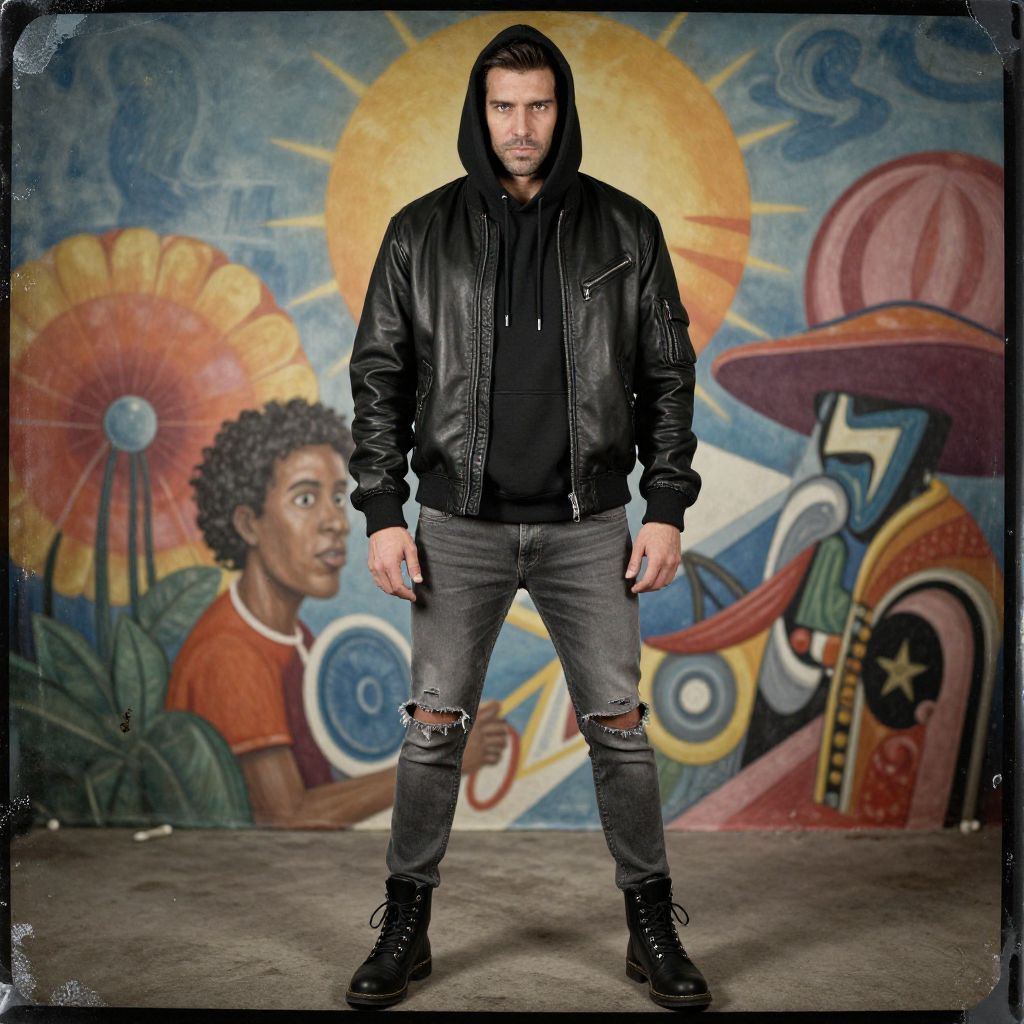 A man, matte black leather bomber jacket, grey ripped skinny jeans, oversized black hoodie, black lace-up boots, subtle silver hardware, vibrant murals, collodion wet plate style, confident expression Man has masculine face and piercing eyes