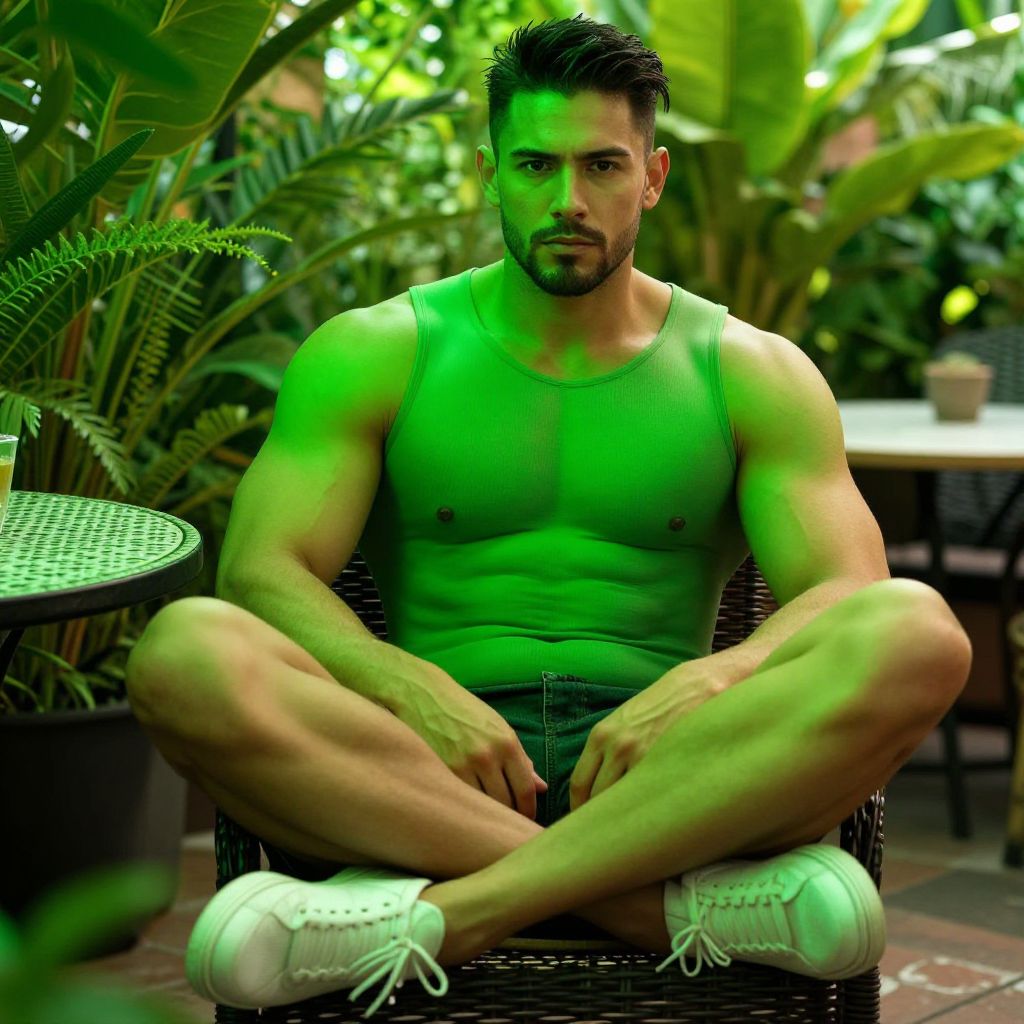 A muscular man with a striking green hue sits relaxed on a patio, enjoying a moment of leisure. The vibrant greenery around him complements his bold appearance, creating an eye-catching composition that exudes confidence and strength.