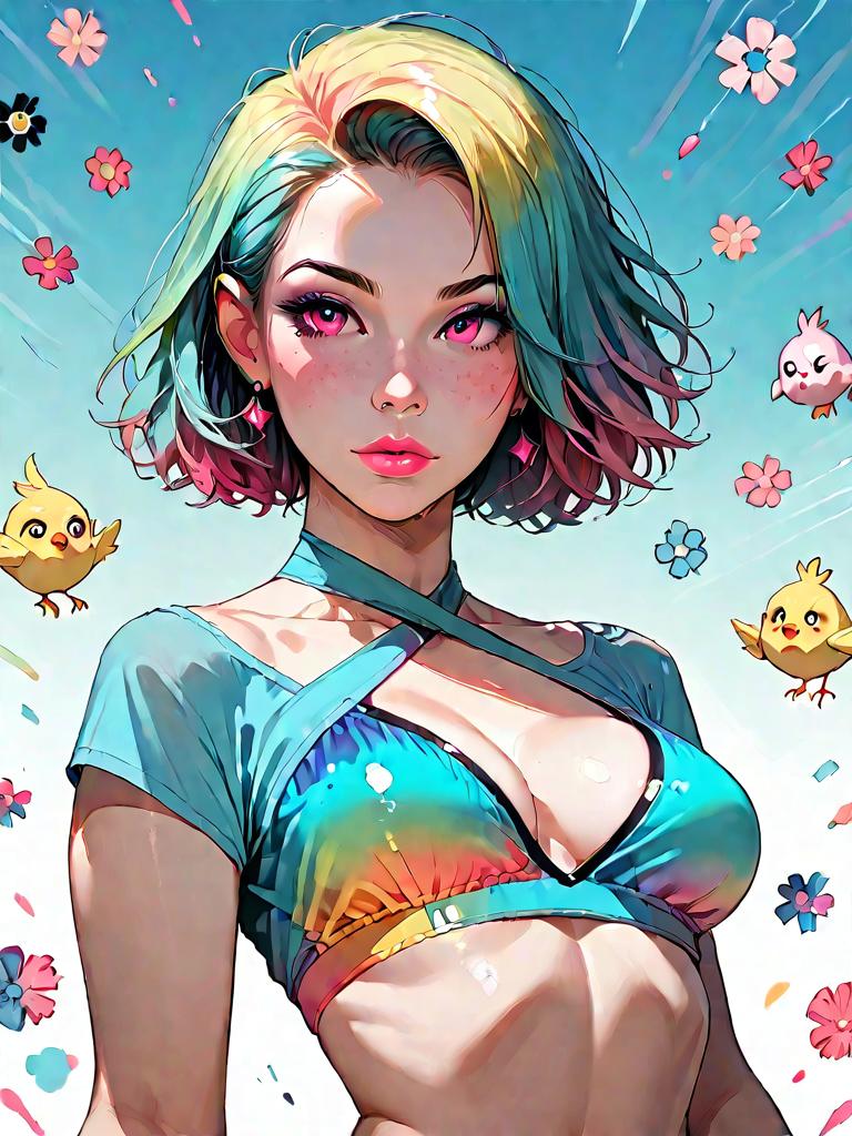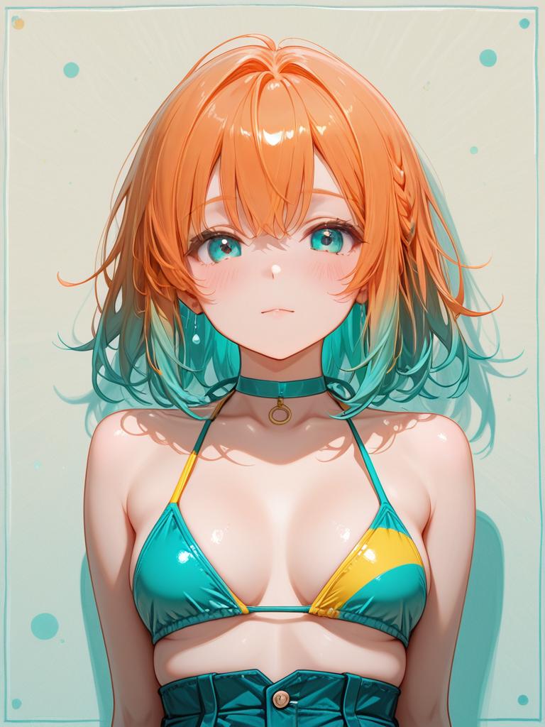 Digital illustration of an anime-style girl with short, orange and teal hair wearing a vibrant color block bikini with a halter neck top and high-waisted bottom. The bikini features a soft nylon blend with seamless stitching in teal and yellow shades, complemented by a teal choker with a ring. The girl has large aqua eyes and a neutral expression, set against a light, minimalist background.