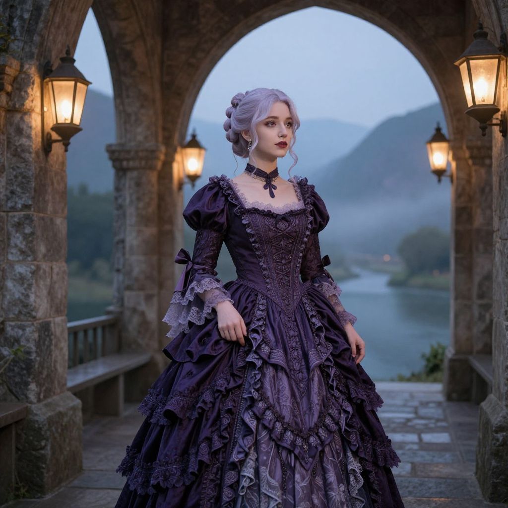 A young woman with pale lavender hair styled in an elegant updo is dressed in a detailed Victorian-inspired dark purple gown, standing gracefully by an ancient stone archway adorned with glowing lanterns. The softly lit evening setting, with misty mountains and a serene river in the background, creates a fantasy ambiance enhanced by the delicate lace and intricate textures of her attire.