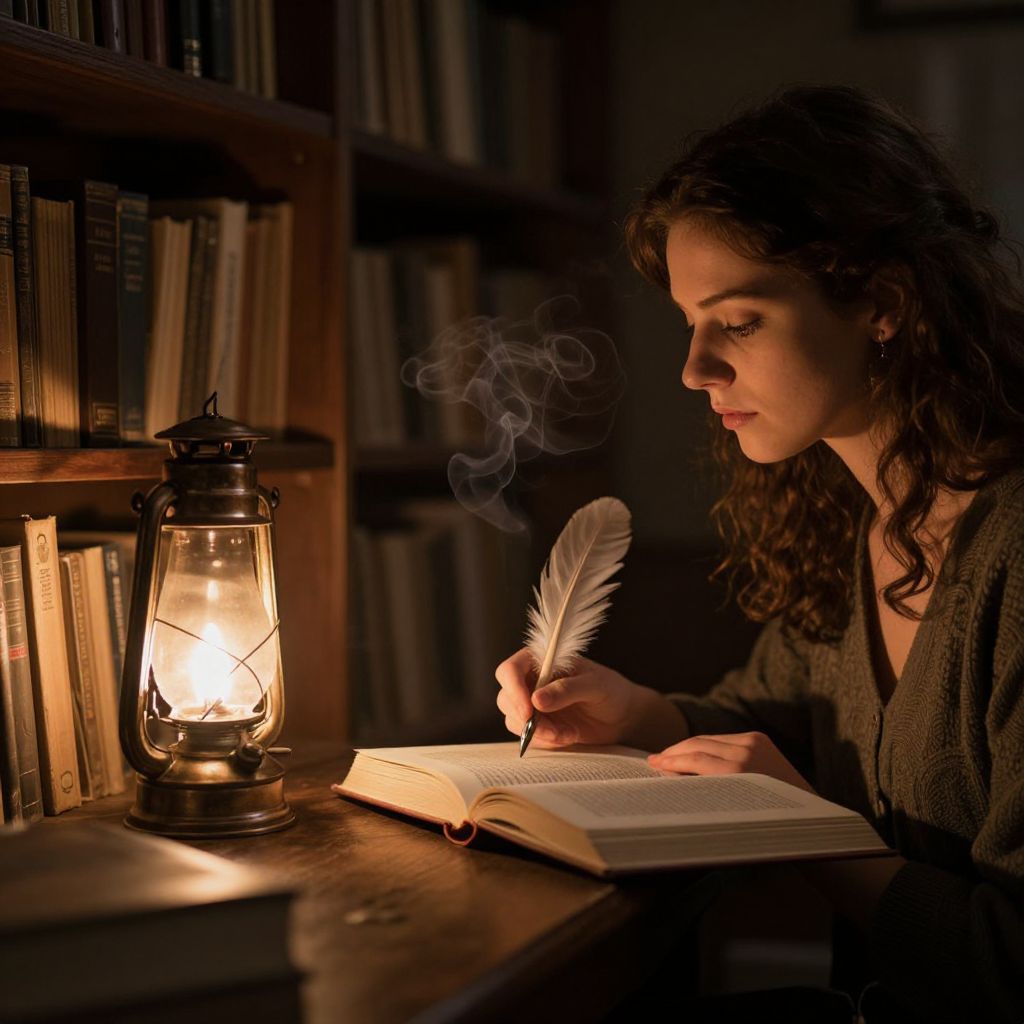 Photograph of a young woman with curly dark hair, wearing a dark green sweater, sitting at a wooden desk in a dimly lit library. She is writing with a white feather quill in an open book, illuminated by the warm glow of an antique lantern with visible smoke. The background features tall, dark bookshelves filled with books. The lantern's light casts soft shadows, highlighting the woman's focused expression and the texture of the wooden desk. The overall atmosphere is cozy and introspective, evoking a sense of old-world study and creativity.