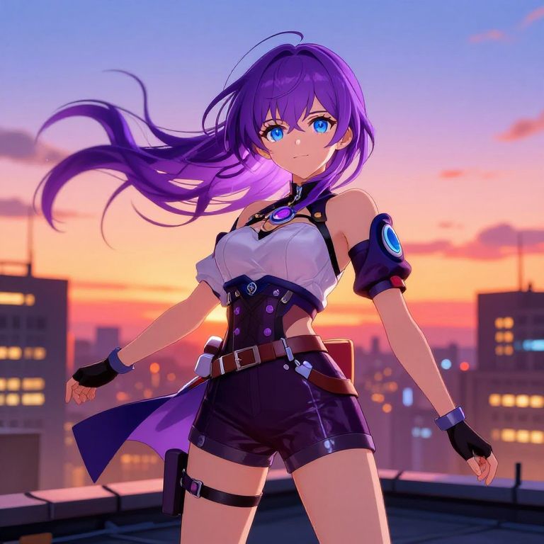 Blue eyes purple hair anime style character standing on a rooftop at sunset, cityscape in the background with glowing windows, wind blowing hair dramatically, detailed outfit with futuristic accessories, vibrant and sharp color contrast, energetic and dynamic pose