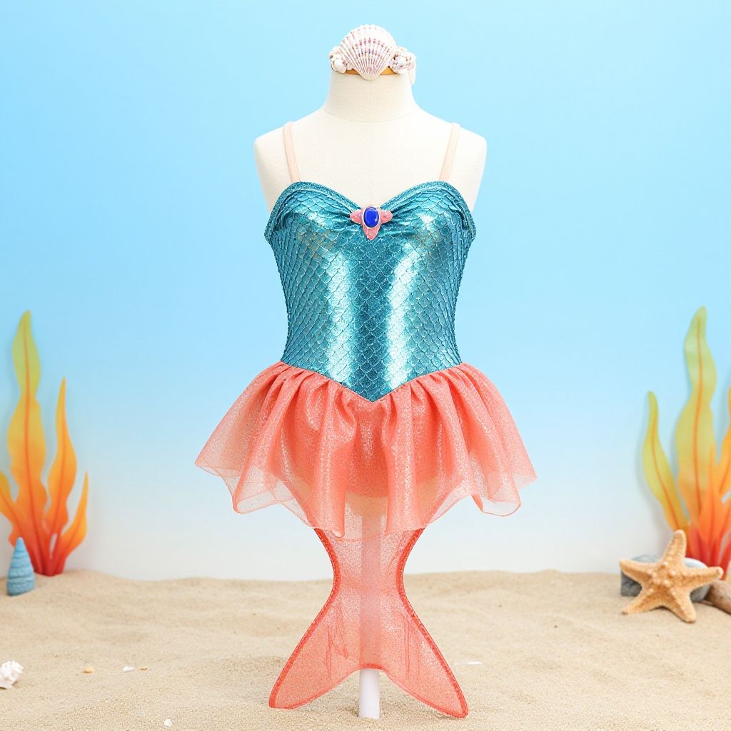 Photograph of a mermaid dress mannequin: teal shimmer top, red tulle skirt, fish tail, white background, sandy floor, orange