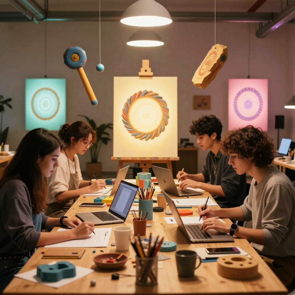 Fun AI prompts illustrating a creative workshop where artists and AI collaborate on painting, sculpting, and digital art, surrounded by floating tools, glowing canvases, and a warm, inventive atmosphere full of energy.