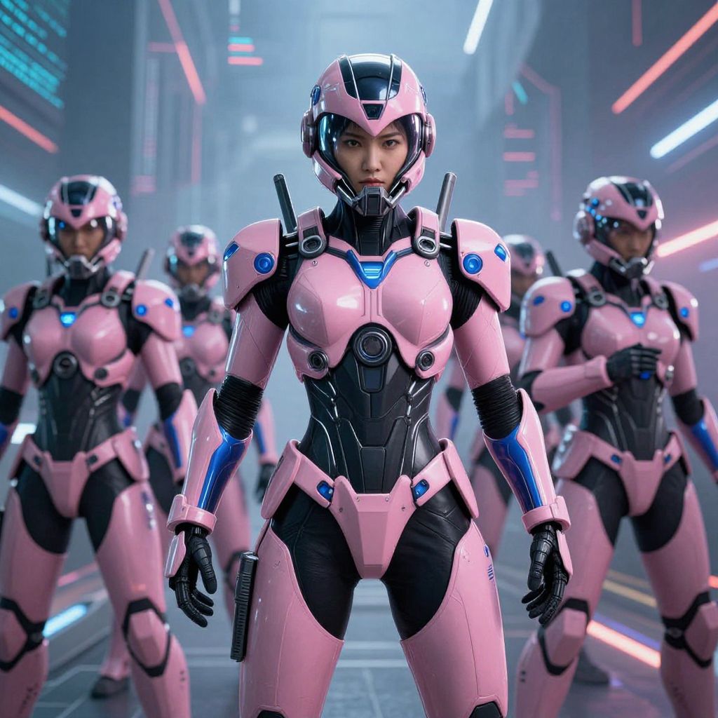 In the heart of a futuristic battlefield, an Asian woman commands her soldiers with an aura of determination and strength. She is clad in a striking sci-fi mecha suit, a fusion of pink and black armor with accents of royal blue, exuding a sense of power and resilience. The suit is meticulously detailed, with intricate mechanical components and glowing lights that highlight its advanced design. The woman's helmet, a sleek combination of black and pink, features a transparent visor that reveals her focused expression. Surrounding her are her soldiers, similarly equipped in matching suits, forming a cohesive and formidable unit. The background is a blur of motion and light, with a data stream and volumetric effects adding to the dynamic and intense atmosphere. The lighting is dramatic, with rays of light piercing through the scene, casting dramatic shadows and enhancing the cinematic quality of the image. The overall composition is balanced, with the woman at the center, her soldiers flanking her, creating a sense of unity and readiness for battle. The scene is a vivid portrayal of a future conflict, where technology and human strength converge in a struggle for survival.