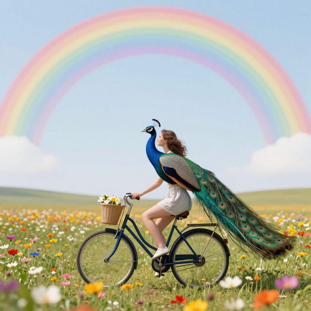 A whimsical scene unfolds as a peacock, adorned with shimmering plumage, gracefully perches atop a bicycle, ridden by a woman amidst a field of vibrant wildflowers, all beneath a colossal, pastel rainbow arching across the sky.
