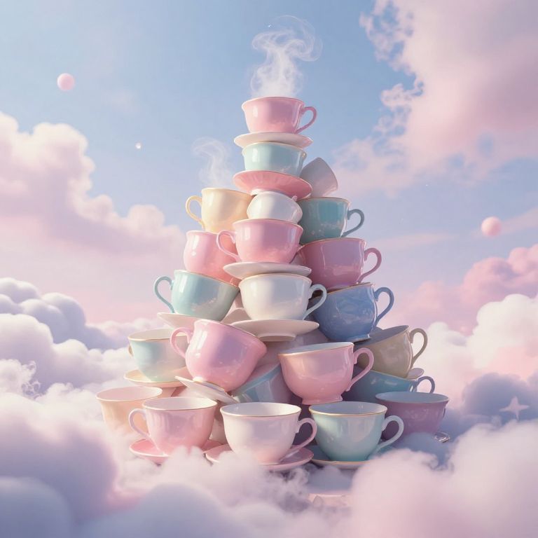 A digital artwork featuring a pyramid of pastel-colored teacups and saucers, stacked against a dreamy sky-blue background with soft, pink-tinted clouds. The teacups, in hues of pink, blue, white, and green, emit wisps of steam, suggesting they are hot. The pyramid is centrally positioned, with the cups and saucers creating a harmonious, whimsical tower effect. The light and shadows create a gentle, ethereal glow, enhancing the surreal, floating sensation. The overall composition evokes a sense of fantasy and tranquility.