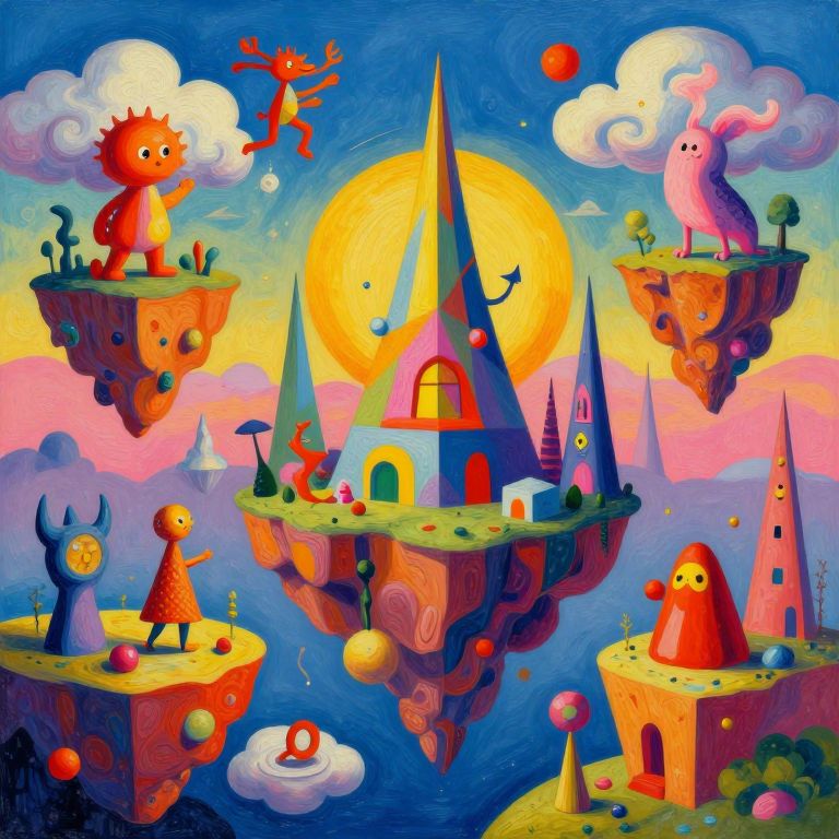 Vibrant, surreal painting of two colorful, spiky creatures touching a large, green cactus with yellow accents and a bright, swirling night sky