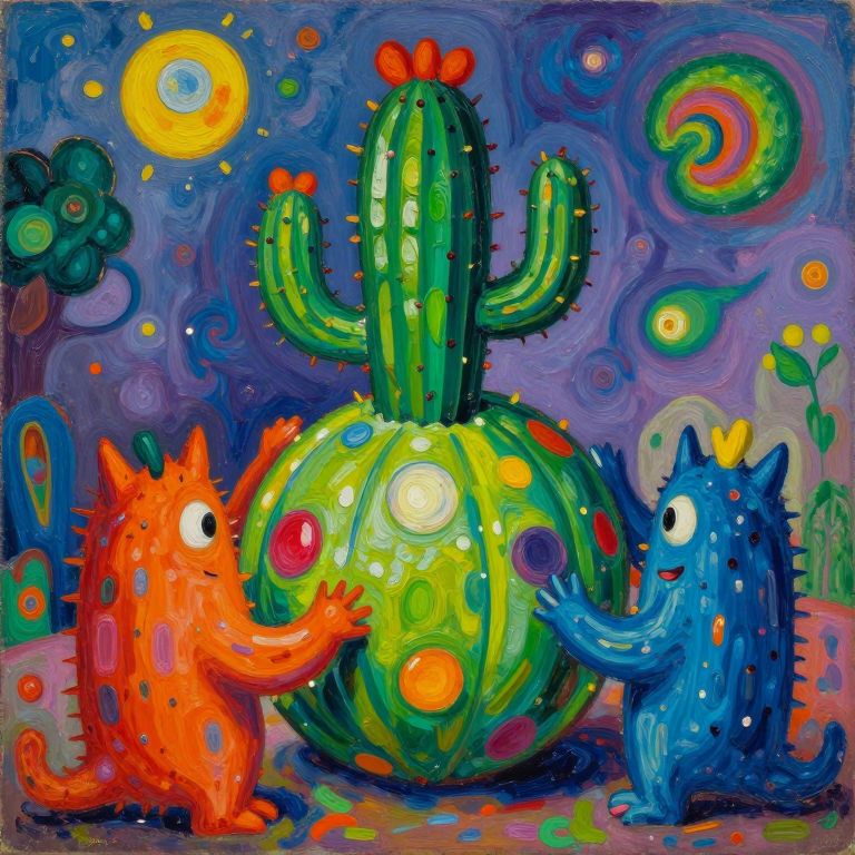 This vibrant digital painting depicts two whimsical, anthropomorphic creatures with spiky, colorful fur—one orange with red spots, the other blue with yellow spots—touching a large, green cactus with yellow and red spots. The cactus has two arms and a bright red flower on top. The background is a swirling, psychedelic mix of deep blues, purples, and greens with abstract shapes, including a yellow sun, a green and purple spiral, and a blue flower. The texture is rich and textured, with thick, expressive brushstrokes. The scene exudes a playful, surreal atmosphere.