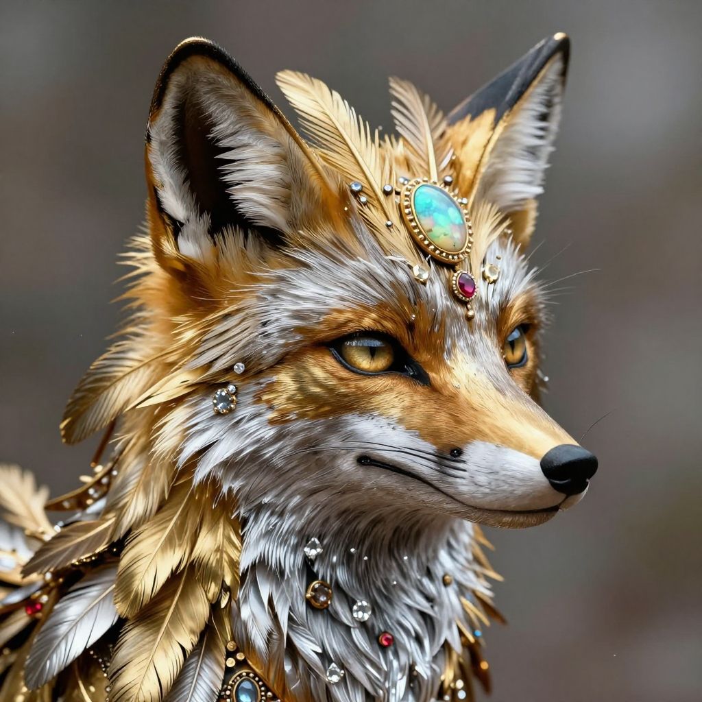 Detailed digital painting of a regal, golden-furred fox with piercing amber eyes, adorned with a turquoise gem and jeweled feathers, set against a