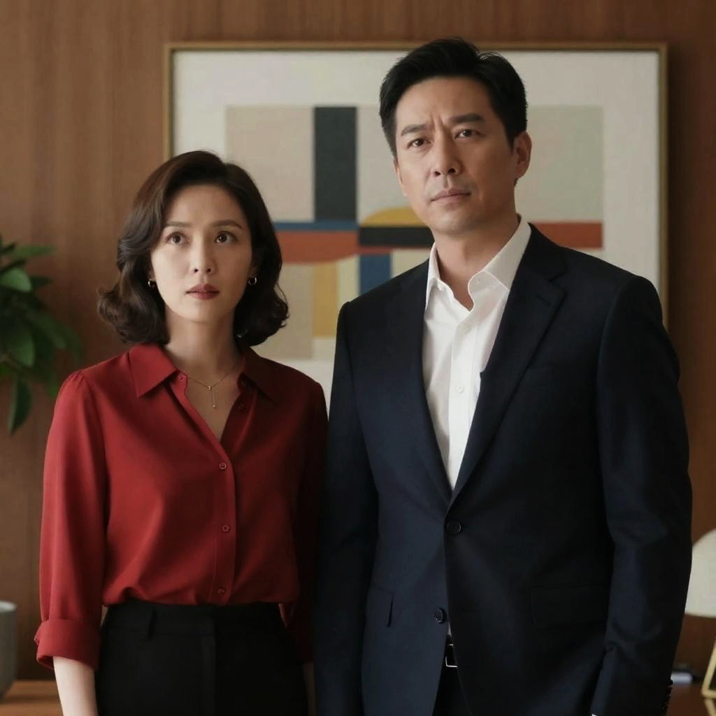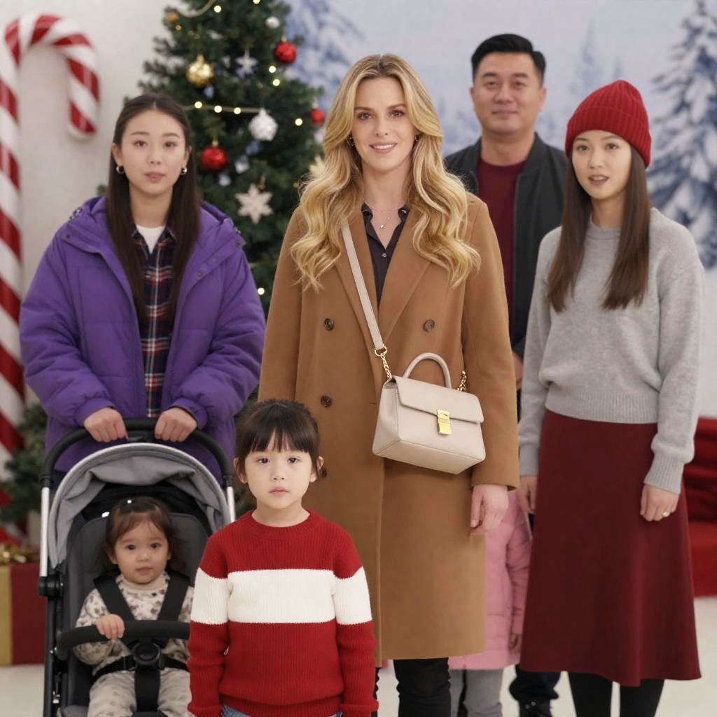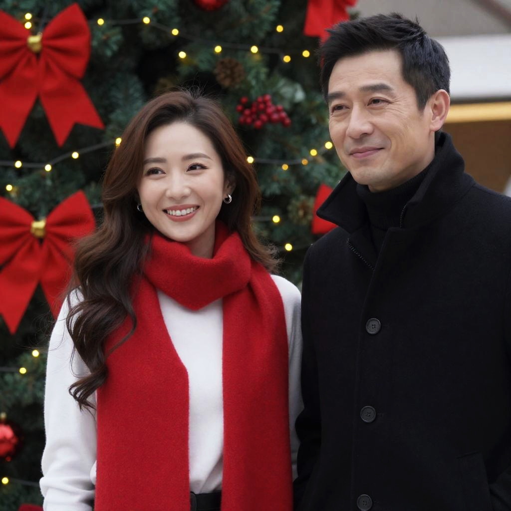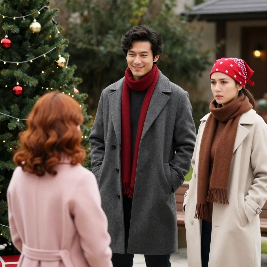 Photograph of a man in a gray coat playfully leaning behind a woman in a red knit hat, red sweater, and blue jeans. The woman smiles, hands on hips. Background: two women, one with curly hair and scarf, blurred. American flag on glass barrier. Evening setting.