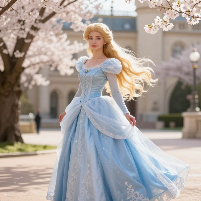 Photograph of a young woman with long, flowing blonde hair, wearing a light blue, full-length, Victorian-style ball gown with puffed sleeves and intricate white embroidery. She stands in a sunlit garden with cherry blossom trees in bloom, their pink petals creating a soft, delicate backdrop. The background also features a grand, classical building with arched windows. The woman's fair skin and delicate features give her an ethereal, fairy-tale appearance. She gazes confidently at the camera, with a slight smile. The image has a bright, dreamy quality, enhanced by the sunlight filtering through the blossoms.