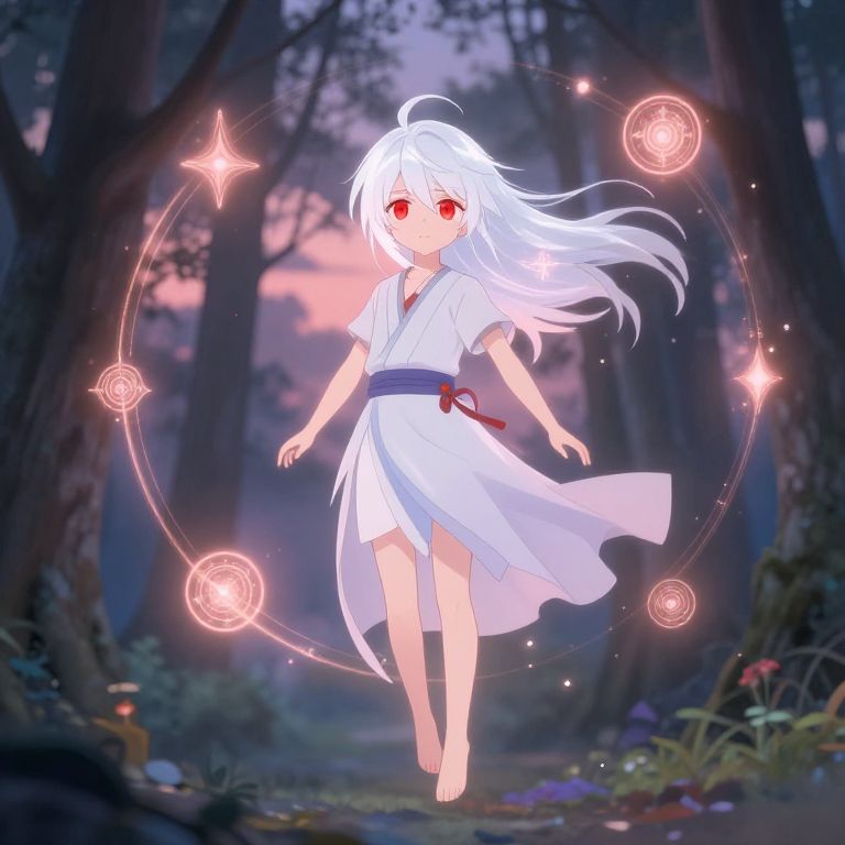 White hair and red eyes anime boy with a mystical aura, floating above a serene forest at twilight, gentle wind blowing his silver hair, glowing red eyes, surrounded by glowing magical symbols, intricate background with soft color palette.
