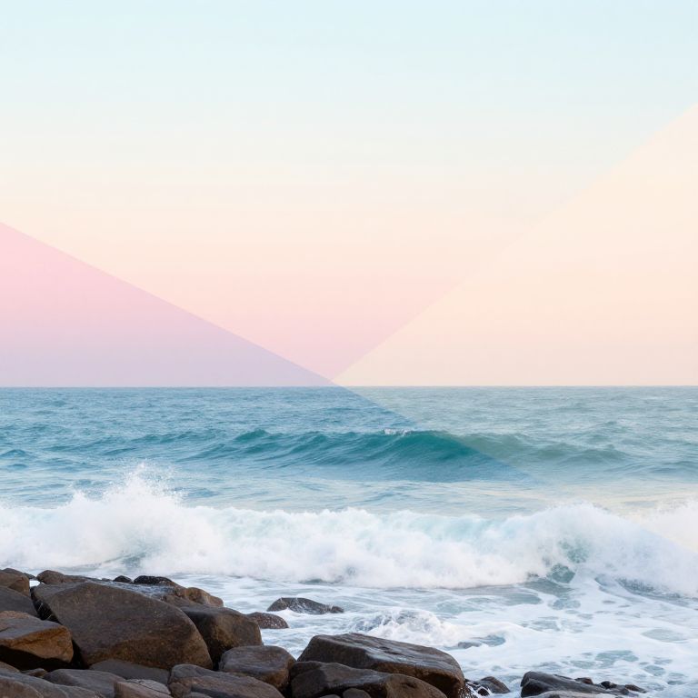 Geometric ocean waves crashing on a rocky shore, pastel colors, sharp triangular shapes blending with soft gradients, abstract seascape, modern minimalistic style