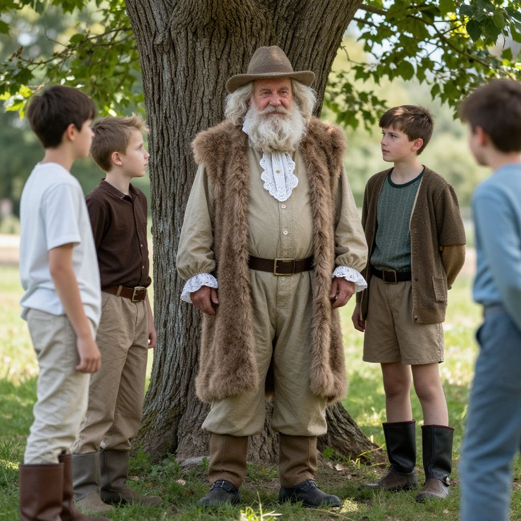 Photograph of an elderly white man with a white beard, dressed in a beige medieval-style tunic, brown fur vest, and wide-brimmed hat, standing under a large tree. He has white lace cuffs and a black belt. Four young boys, three white and one slightly tanned, are standing around him, wearing varying outfits including white shirts, brown shirts, khaki shorts, and black knee-high socks. The background shows a sunlit, grassy field with trees and a bright, clear sky. The boys are looking at the man, who stands at the center, exuding a wise and authoritative presence.