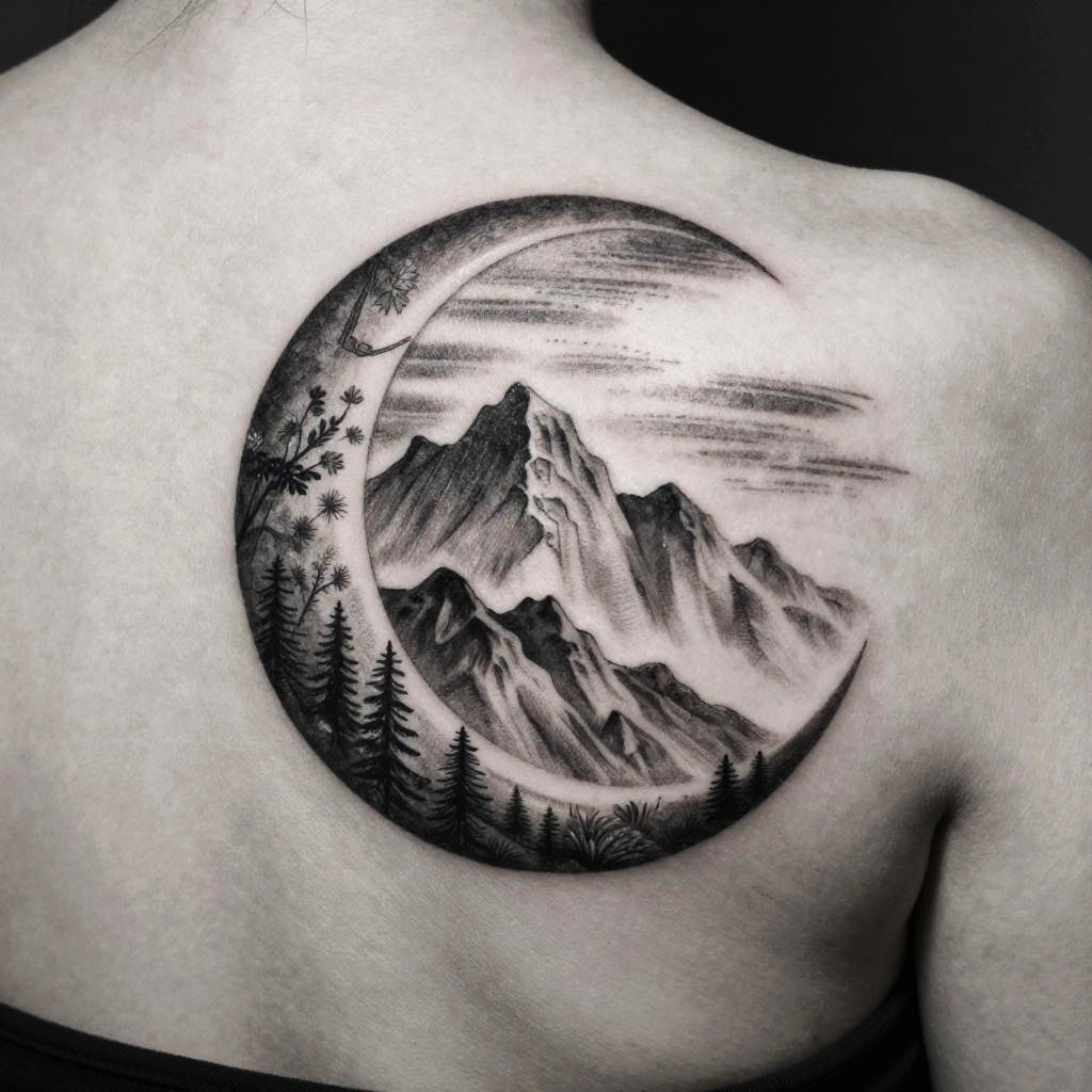 Monochromatic tattoo depicting a surreal mountain landscape inside a crescent moon, using layered grayscale shading to achieve depth and a dreamy, ethereal vibe on back shoulder.