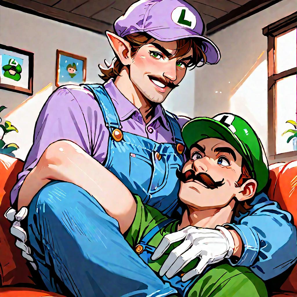 Score_9, score_8_up, score_7_up, source_anime, scissorhold, leg lock, sitting, indoors, 2boys, evil smile, seductive smile, Incrsluigi, luigi, green headwear, blue overalls, white gloves, long sleeves, Waluigi, mustache, teeth, pointy ears, brown hair, hat, purple headwear, purple shirt, muscular male