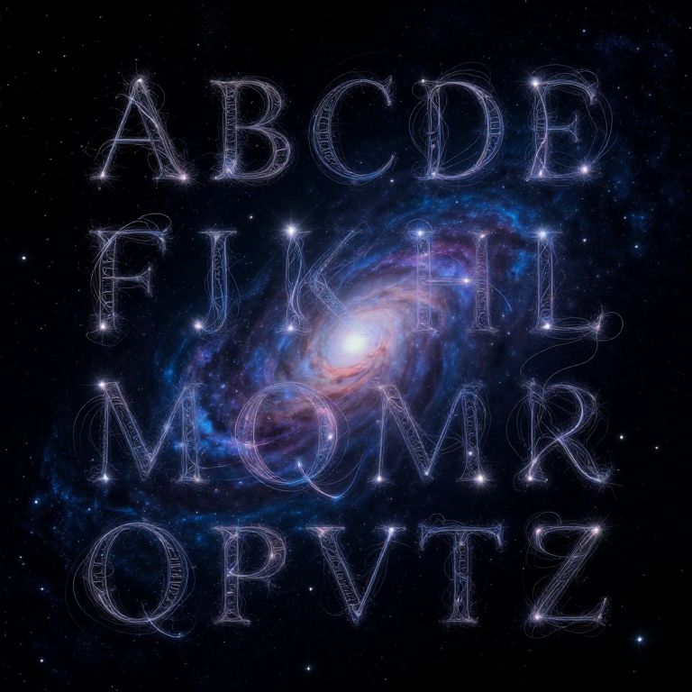 Digital artwork of the alphabet (A-Z) in glowing, wireframe letters against a vibrant, starry background with a glowing spiral galaxy.