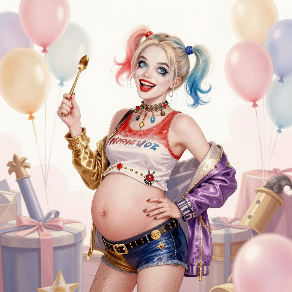 Digital art of a pregnant, smiling Harley Quinn holding a spoon, wearing a "Harley Loves" tank top, denim shorts, fishnet stockings,