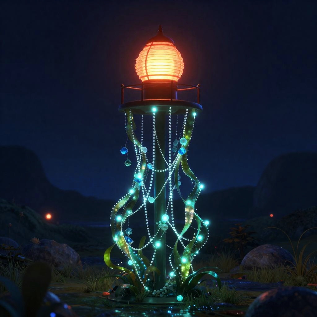 A magical underwater scene featuring a tide siren lantern adorned with bioluminescent kelp, sea glass spheres, and drifting pearls. The glowing lantern emits a warm red light, contrasting with the cool blue and green hues of the surrounding deep sea environment and coral formations.