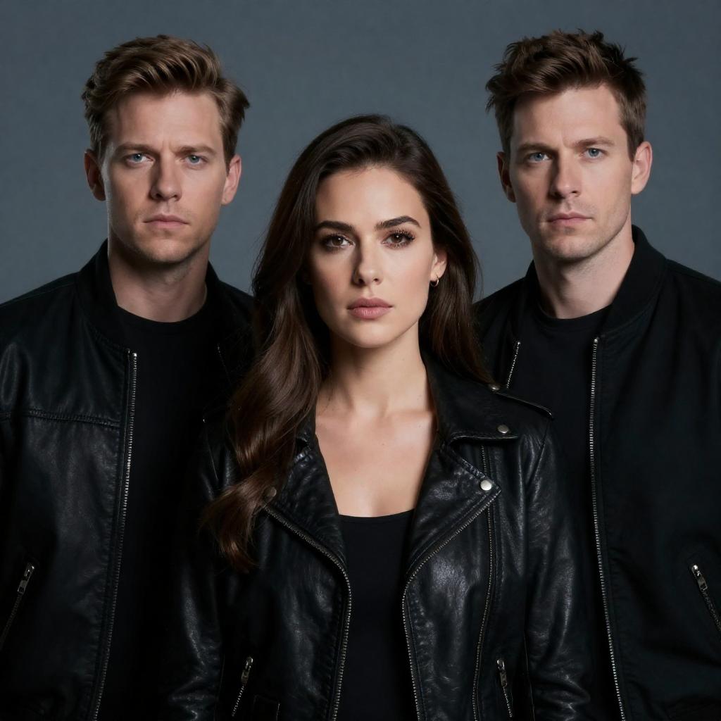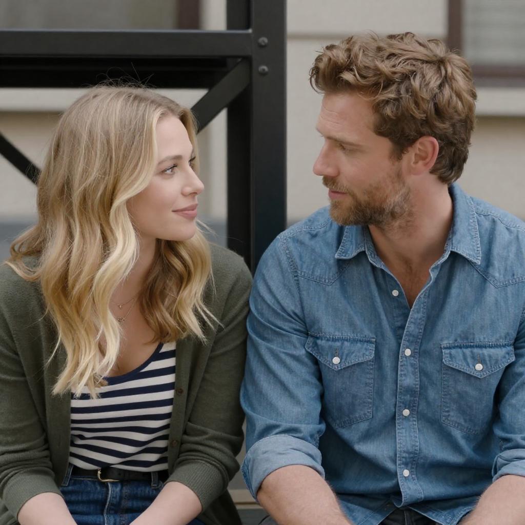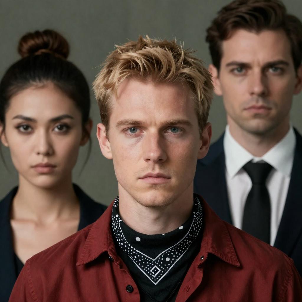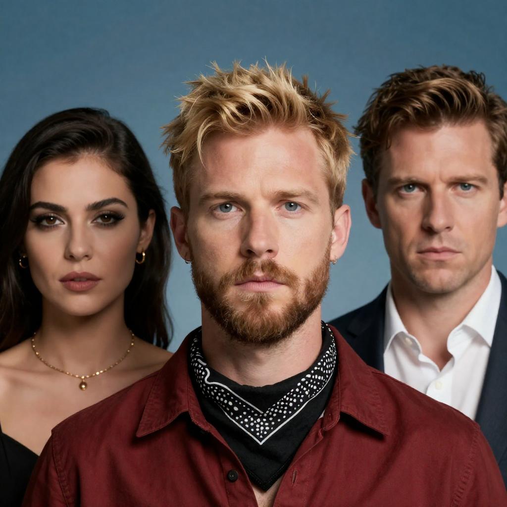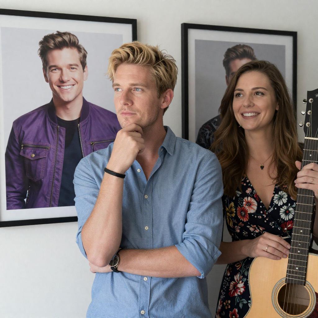 Photograph of two people standing in front of two framed posters. Man with blonde hair, blue shirt, black wristband, thinking pose, looking sideways. Woman with brown hair, floral dress, holding guitar, smiling. Posters of a smiling man in purple jacket. Bright background.