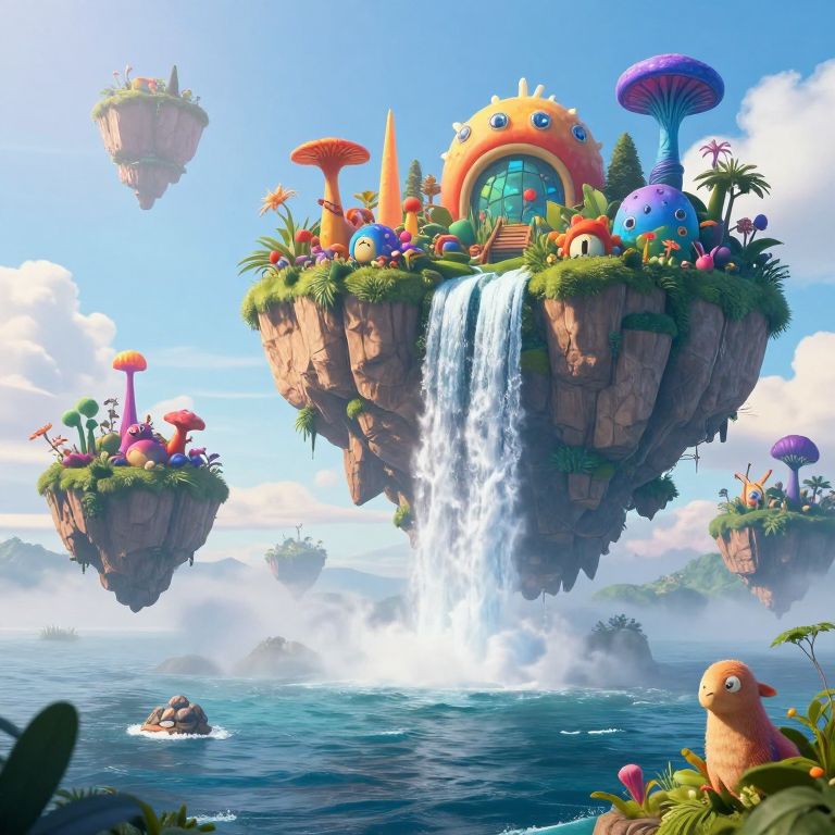 Whimsical digital artwork of floating islands with colorful fungi, a waterfall, and vibrant plants. Blue sky, clouds, and a curious orange bird in