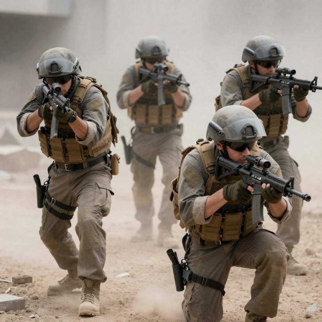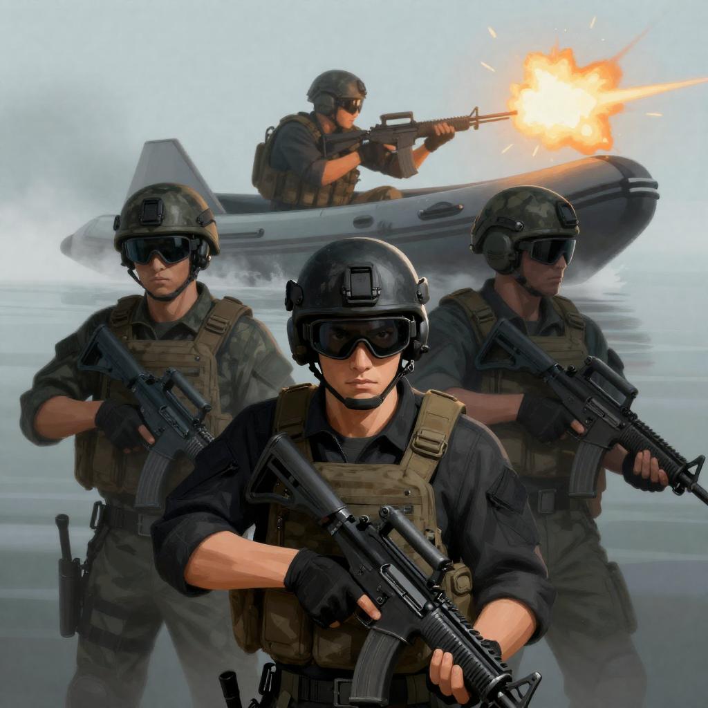 Digital illustration of four soldiers. Foreground soldier in black gear, goggles, and headset, holding rifle, intense expression. Two soldiers behind, wearing camouflage and helmets. Background soldier in inflatable boat, firing rifle, orange explosion. Blue, misty background.