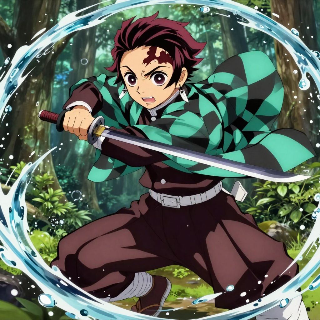 Tanjiro pose in dynamic battle stance, vibrant forest background, detailed anime style, intense expression, flowing Water Breathing sword technique, dramatic lighting
