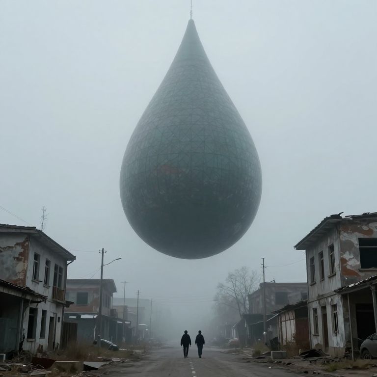 Colossal teardrop-shaped structure hovers ominously above a fog-shrouded, desolate street lined with dilapidated buildings, as two solitary figures walk beneath its looming presence.