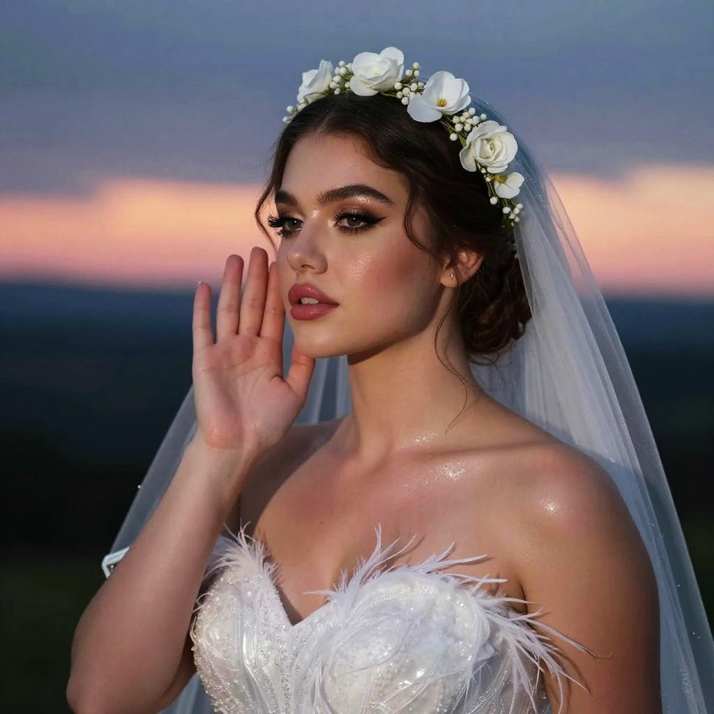 (ultra realistic, 32k, RAW photo:1.1), (high detailed skin:1.1), 8k uhd, dslr, high quality, film grain, (makeup, mascara:1.1), lips, (thick\lips\), (shiny glossy translucent clothing:1.1), wed_sigrun, flower, veil, bride, white dress, hair flower, bridal veil, bare shoulders, strapless, detached collar, feather trim, Posing as if whispering a secret, (busty:1.1), (chubby:0.1), (soft shaded neon light:1.2), dark theme, sunrise, vibrant colors, horizon glow, tranquil
