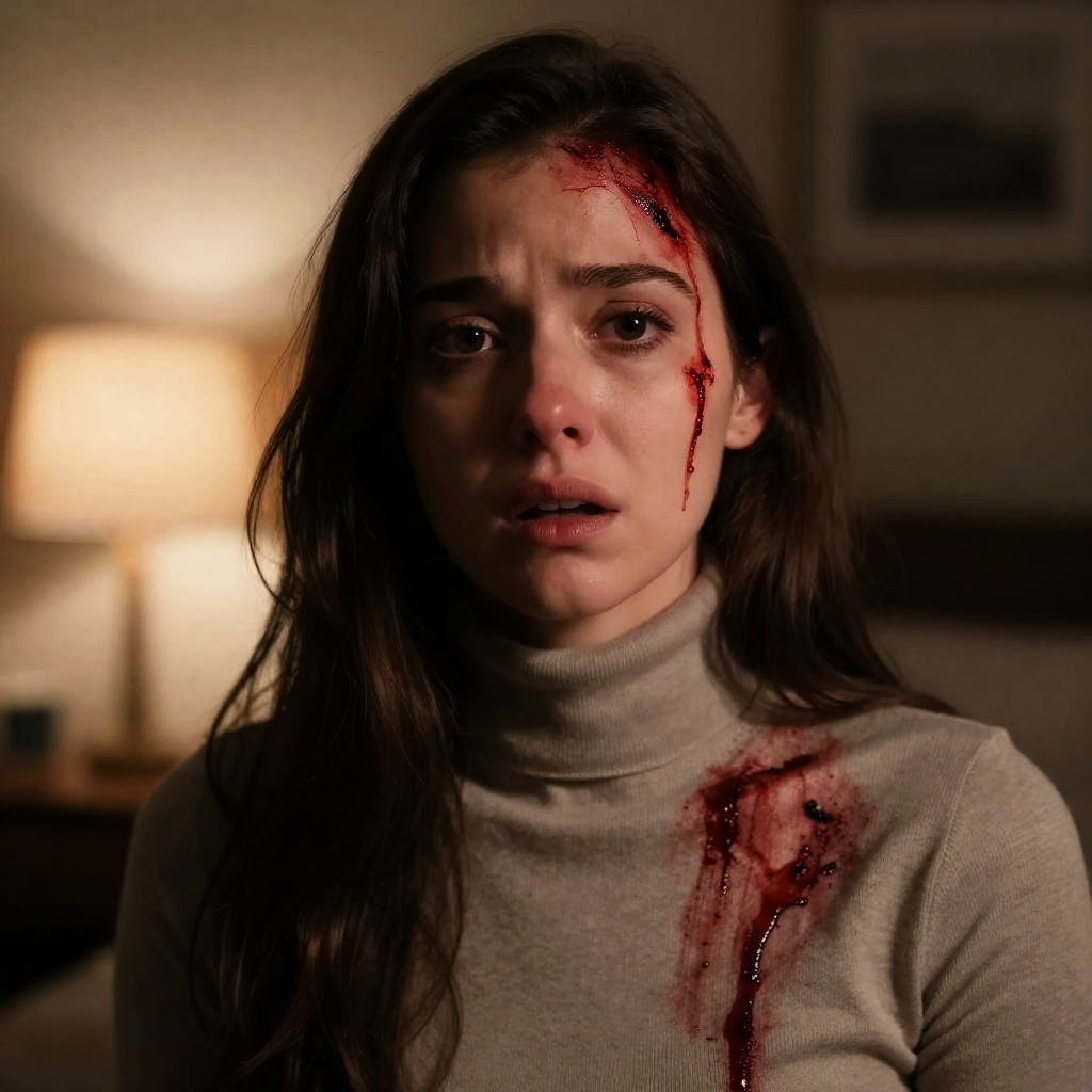 Photograph of a distressed woman with long brown hair, blood on her forehead and upper chest, wearing a beige turtleneck. Warm lamp in blurry background. She looks shocked, mouth slightly open. Dimly lit, close-up shot.