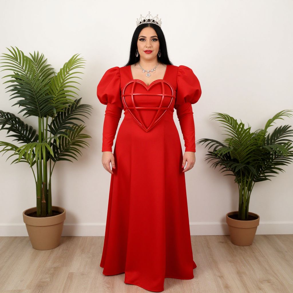 Photograph of a plus-sized woman with long black hair and fair skin, wearing a vivid red, long-sleeved gown with puffed shoulders and a heart-shaped bodice. She has a small tiara on her head and a necklace. She stands centered against a plain white wall, flanked by two potted green palm plants on either side. The floor is light wood, and the overall style is elegant and regal. The bright red of her dress contrasts sharply with the green plants and white background.