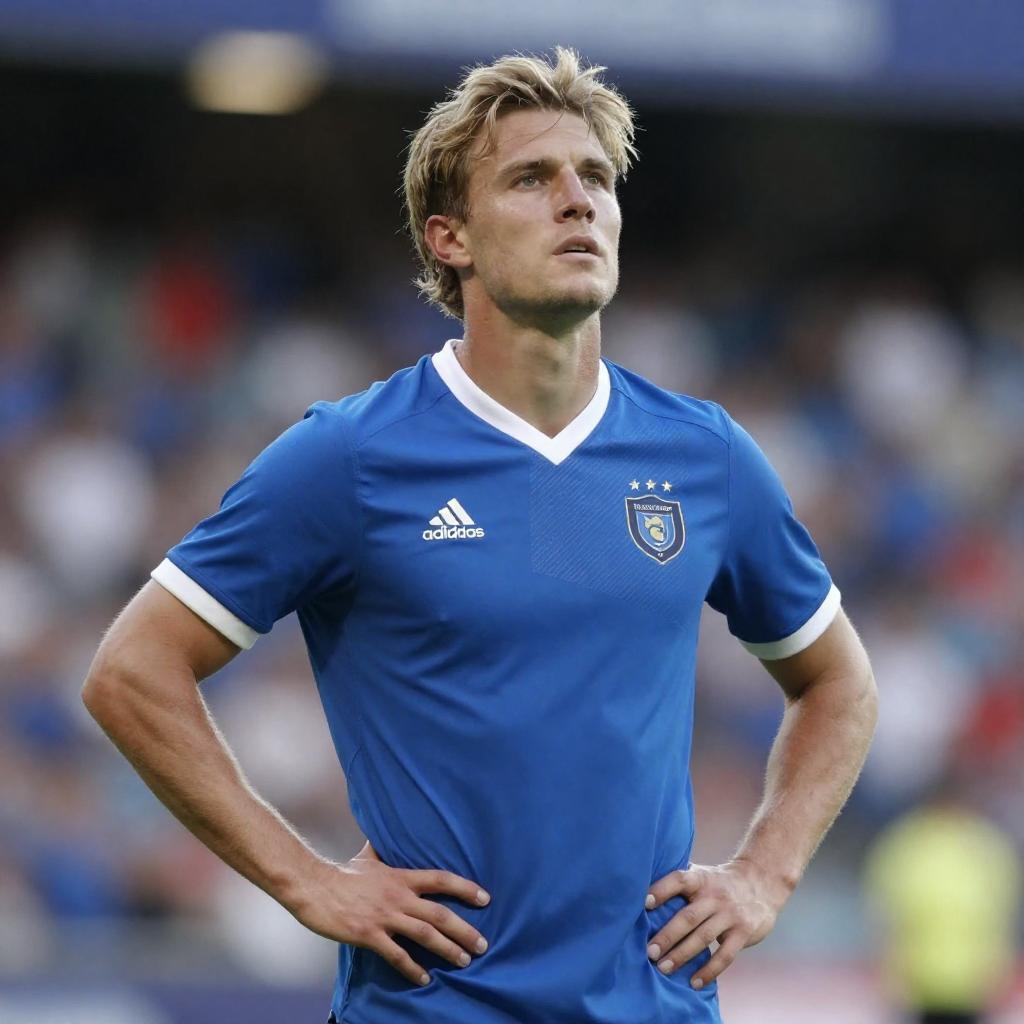 Male soccer player with disheveled blond hair, blue jersey with white trim and "Cahlotine" diagonal stripe, hands on hips, looking upwards, standing in stadium with blurred crowd in background.