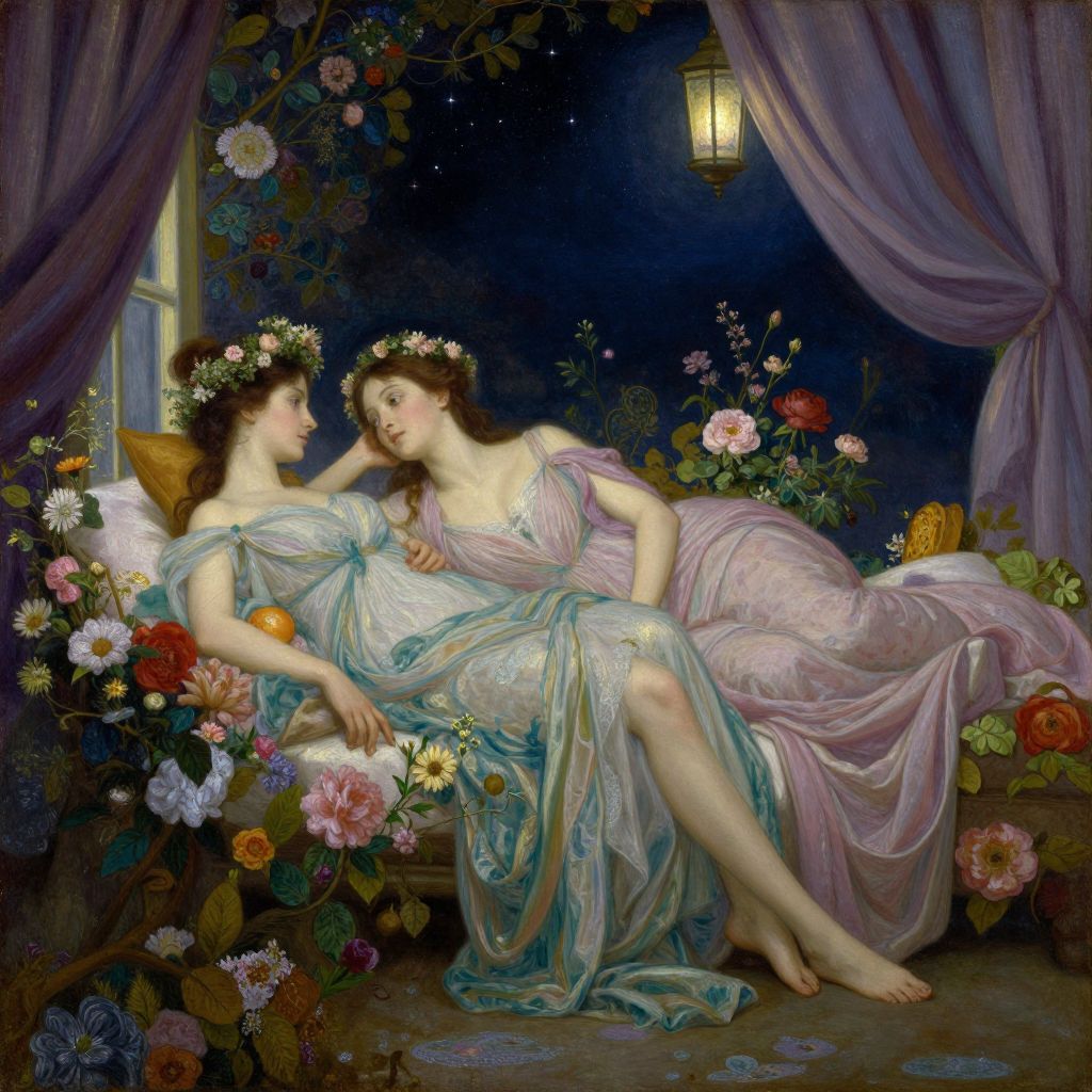 Romantic painting of two fair-skinned women in flowing, pastel dresses, reclining on a flower-filled bench at night, gazing at each