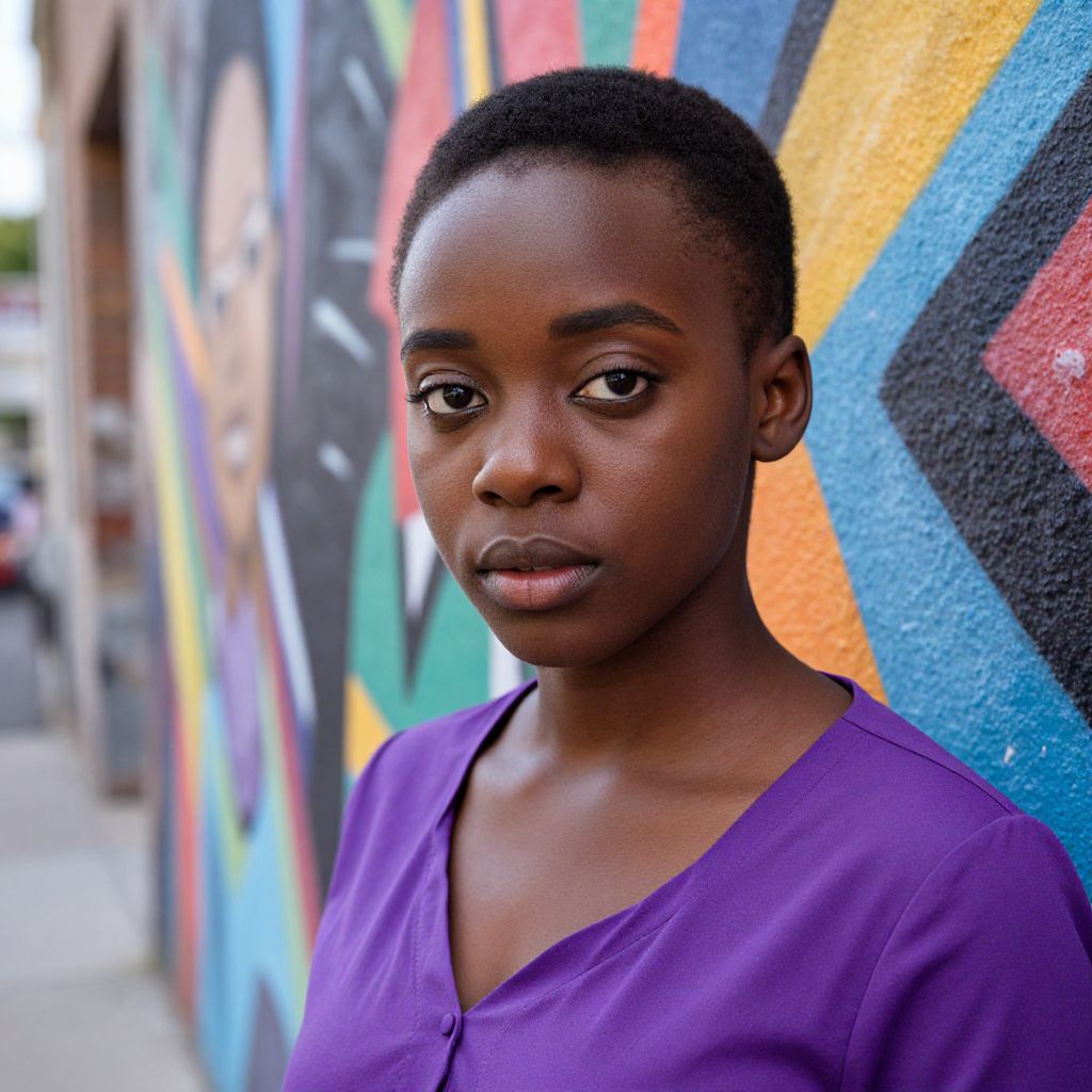 A young African American woman with striking features, wearing a vibrant purple blouse contrasted against her smooth ebony skin. Her eyes are deeply set beneath well-arched eyebrows, reflecting a gaze that seems both introspective and aware of the camera's presence. She stands in a casual pose by an urban mural filled with vivid colors, suggesting themes of community pride and artistic expression. The background is bustling yet maintains focus on her expressive face as she exudes confidence amidst the lively setting.