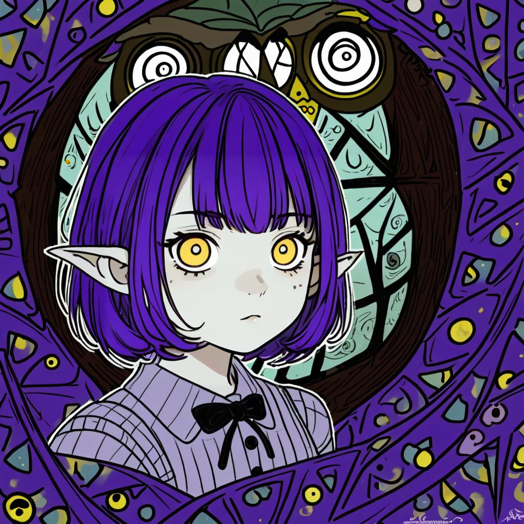 Illustration of an anime girl with short purple hair, pointy ears, and striking yellow eyes, wearing a striped shirt with a black bow tie. The background features a stylized owl design surrounded by intricate purple patterns. The art style is inspired by the character Amity Blight from The Owl House.