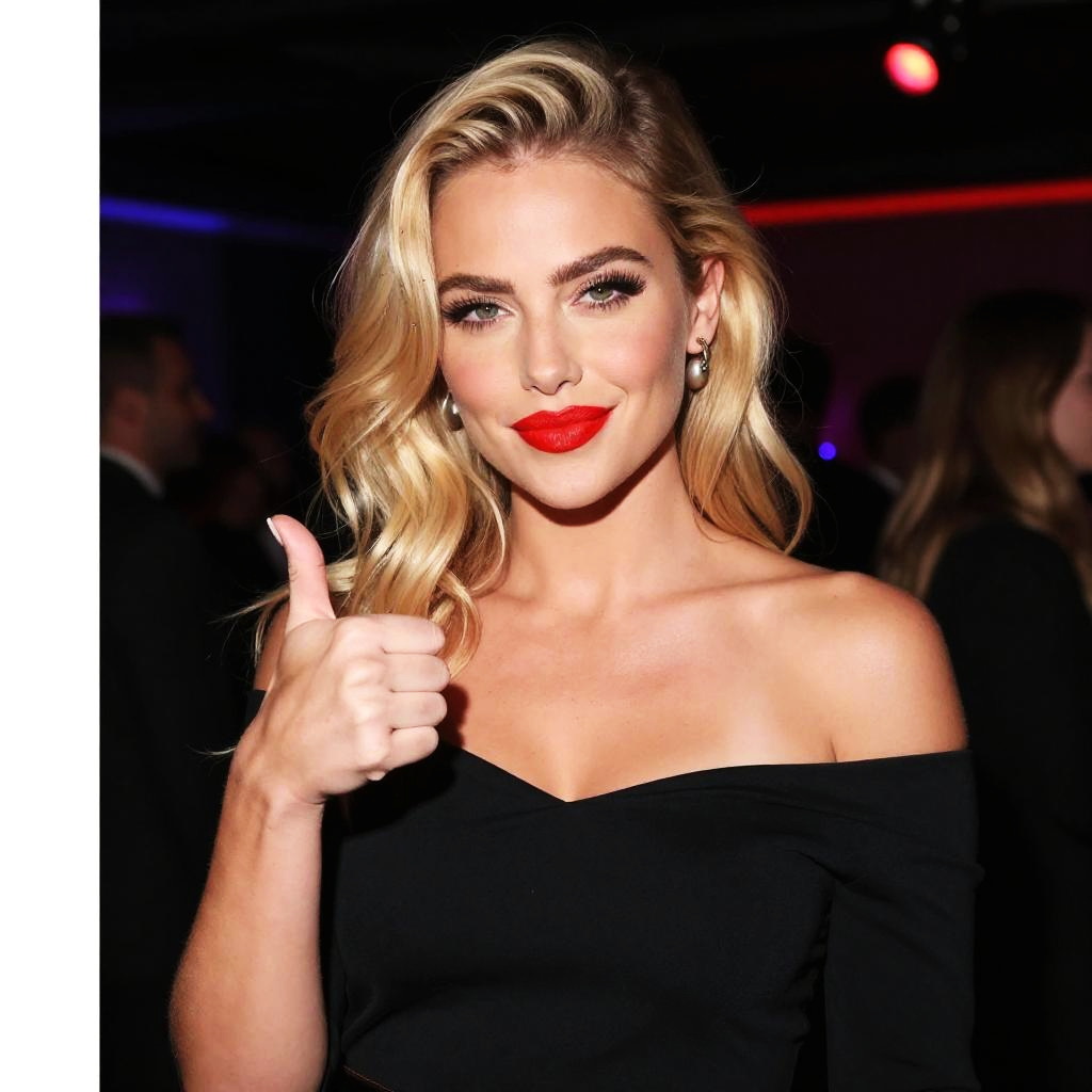 Photograph of a blonde woman with wavy hair, styled to one side, wearing an off-the-shoulder black dress. She has striking red lipstick, dark eyeliner, and subtle eyeshadow. She is giving a thumbs-up with her right hand, positioned near her chest. The background is dark with blurred, colorful lights, suggesting an evening event or nightclub. The image has a high-contrast, vibrant look, emphasizing her bright red lipstick and glowing skin. The woman's confident expression and elegant attire add to her glamorous appearance.