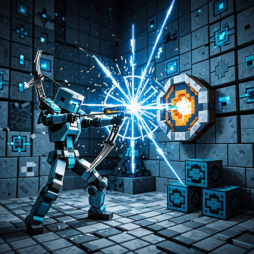 A scene featuring robotic archer holding a plasma crossbow in a slashing stance, with a shattered cyber dome of a generic minecraft lucky block wall, and a electric blue spark trail appearing surprised and excited.