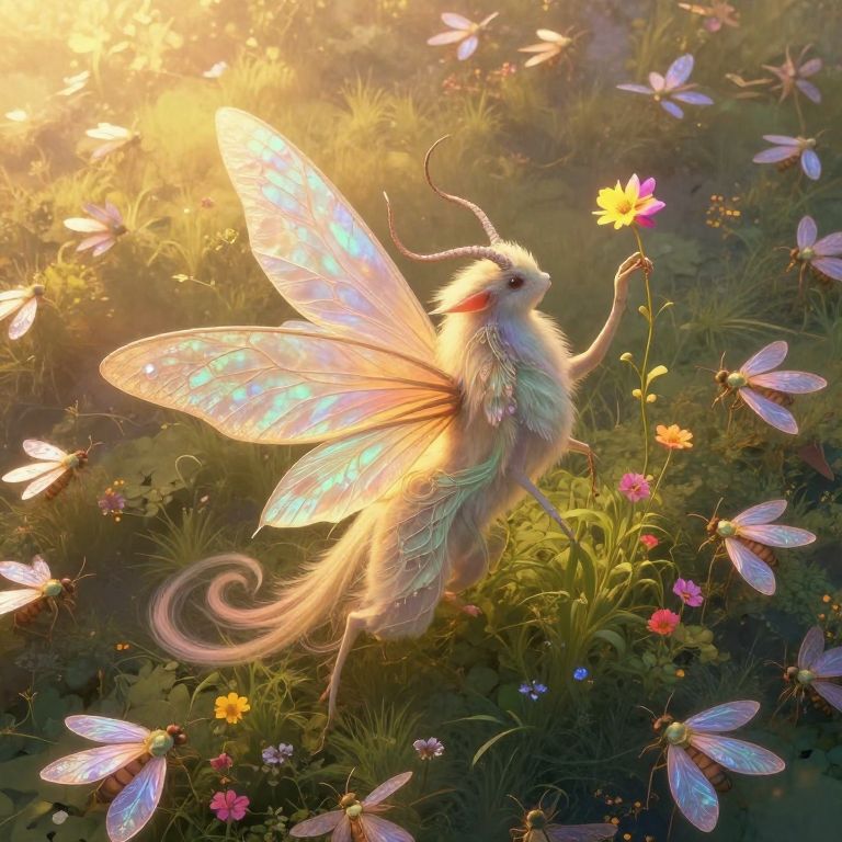 An enchanting digital artwork in the style of Art Nouveau portrays a whimsical scene where a graceful mythical creature stands amidst a field of vibrant, iridescent winged insects. From an aerial perspective, this unique viewpoint showcases the intricate details of the majestic creature's ethereal form as it delicately plucks a flower with its prehensile horn. The soft, dreamlike atmosphere is illuminated by a warm, golden light that filters through the foliage, creating an emotional gradient that evokes both wonder and tranquility in this captivating, surreal panorama.