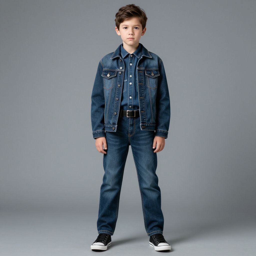 Photograph of a young Caucasian boy with short, dark brown hair, standing against a solid gray background. He is wearing a dark blue denim jacket over a matching denim shirt, paired with dark blue denim jeans and black and white sneakers. The jacket has two chest pockets with small buttons and a black leather belt with a silver buckle. His expression is neutral, and he stands with his hands by his sides, feet shoulder-width apart. The lighting is even, highlighting the texture of the denim fabric.