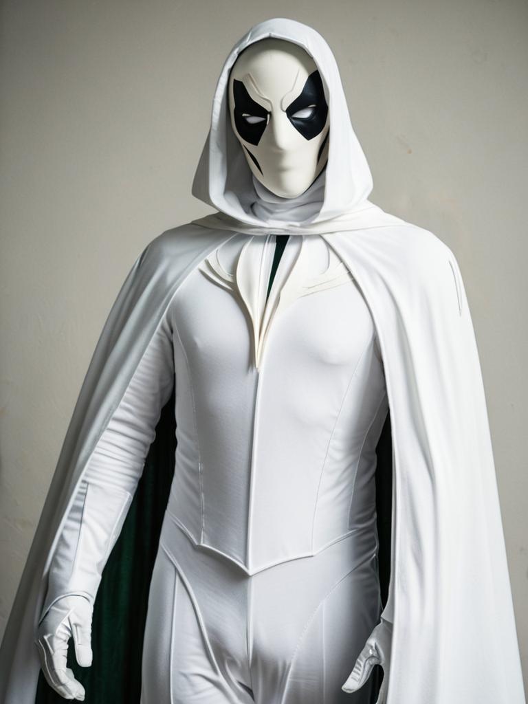 Realistic photo of a man dressed in a white The Spectre cosplay costume, featuring a hood, mask with black details around the eyes, a cape, and form-fitting bodysuit. The costume includes gloves and a stylized chest emblem.