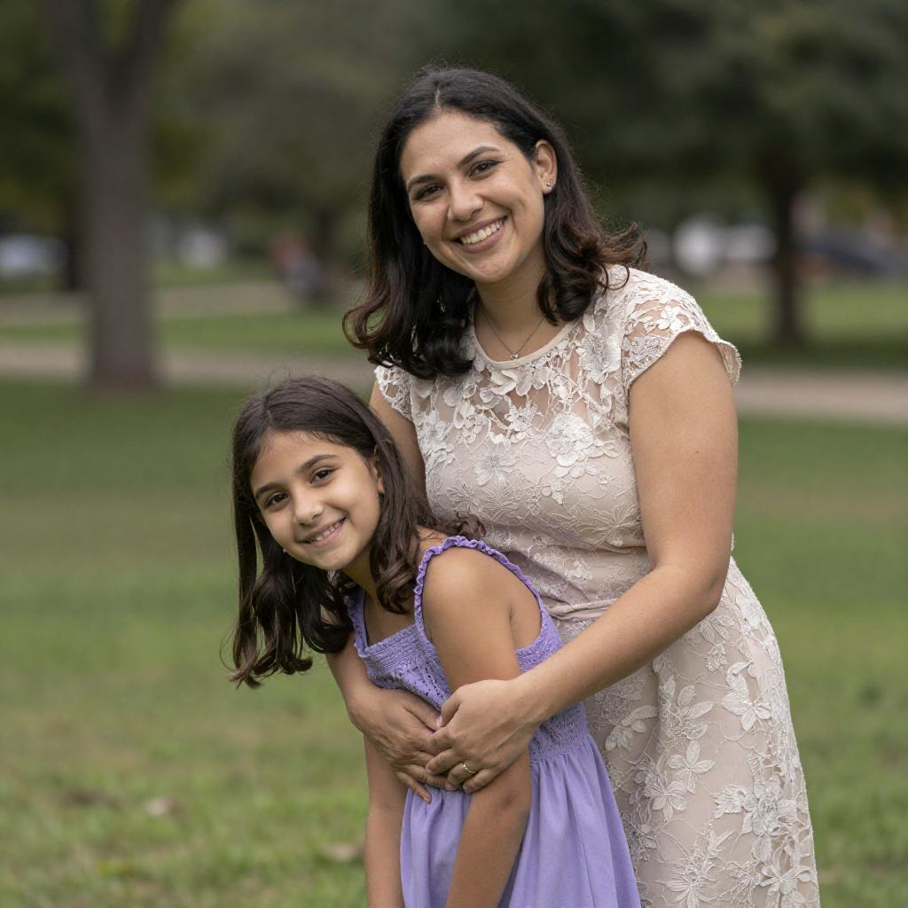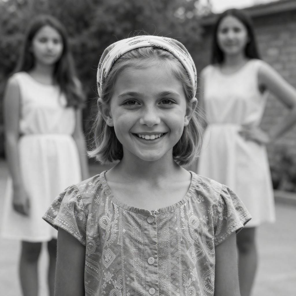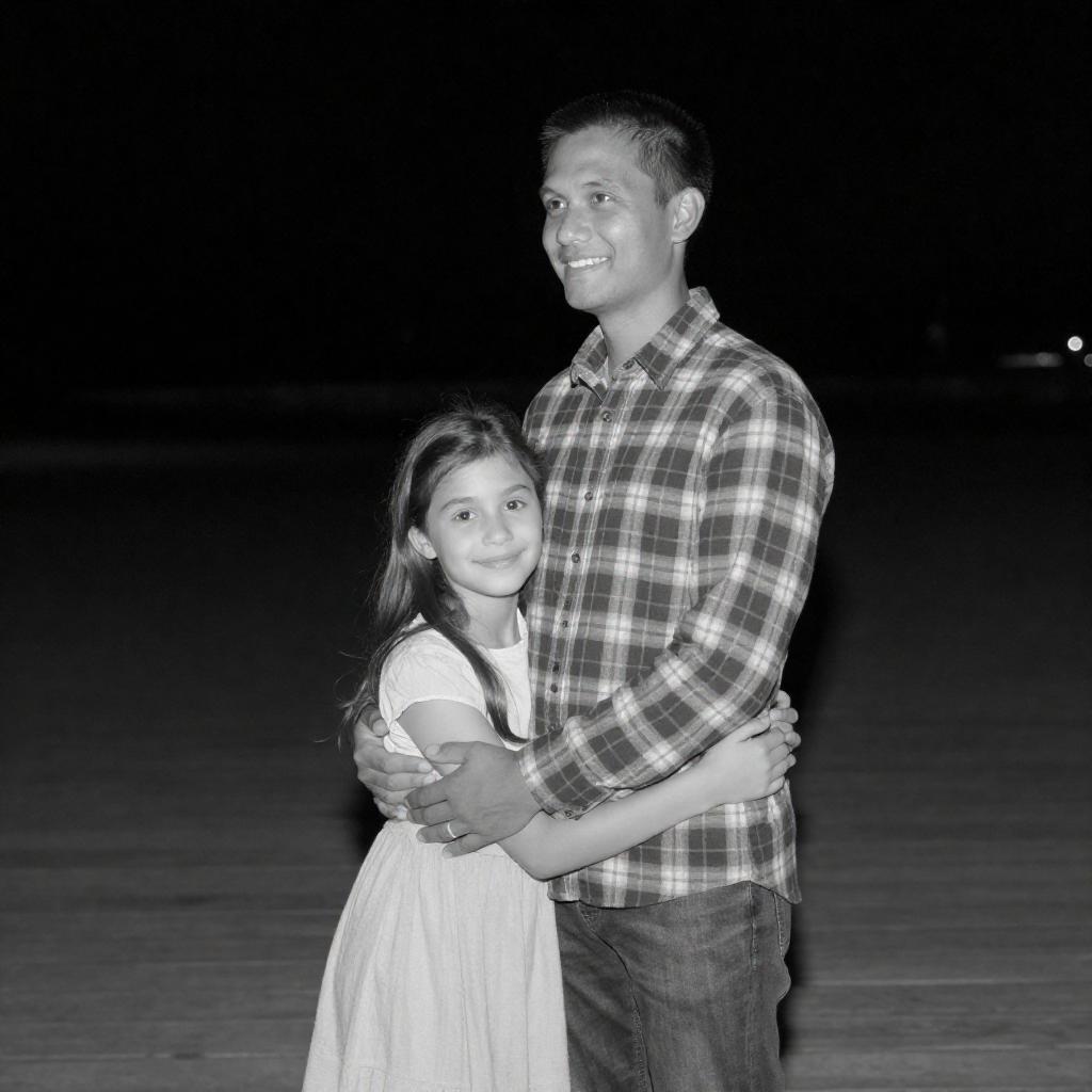Black-and-white photograph of a man and a young girl standing closely together outdoors at night. The man, wearing a plaid shirt and jeans, embraces the girl from behind, who is dressed in a light-colored dress. Both are smiling, with the man looking to the right. The background is dark, with faintly visible wooden planks on the ground.