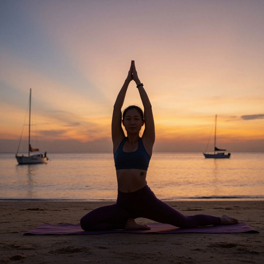 Serene Asian woman practicing yoga on a sandy beach at sunset, surrounded by the tranquil ocean and silhouettes of sailboats under a vibrant sky, embodying relaxation and mindfulness during her travel holiday in Phuket, Thailand.