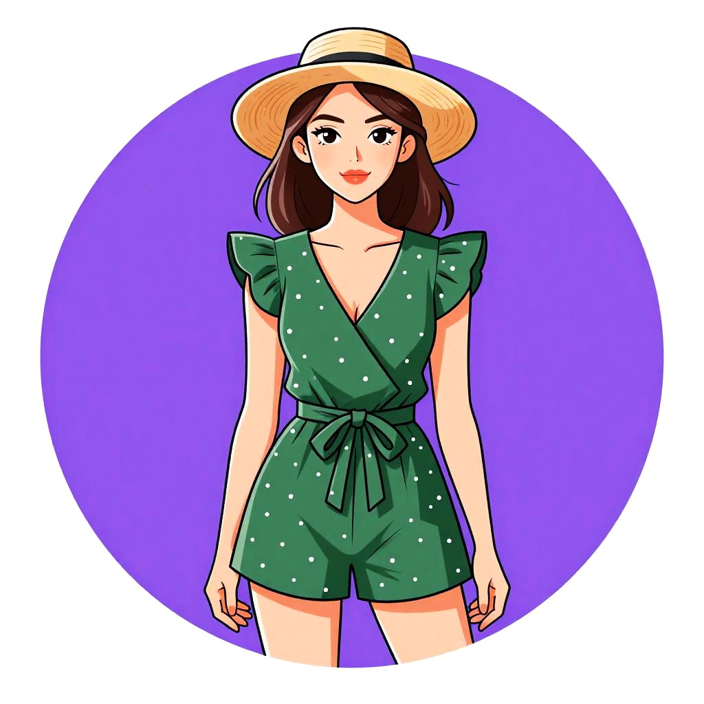 This is a digital illustration in a vibrant, anime-inspired style. It features a young woman with fair skin and dark brown hair, wearing a green, polka-dotted romper with short, ruffled sleeves. She has a cheerful expression with red lips and slightly arched eyebrows. She also wears a wide-brimmed, beige sun hat. The background is a solid, bright purple circle, contrasting with her green outfit. Her hands are relaxed by her sides, and she stands facing forward, occupying the center of the image. The artwork uses bold colors and clean lines, giving it a playful and energetic feel.
