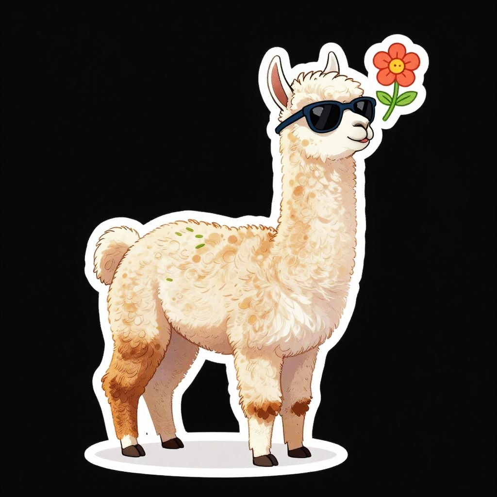Die cut sticker of a llama leaping to catch a flower wearing a sunglasses